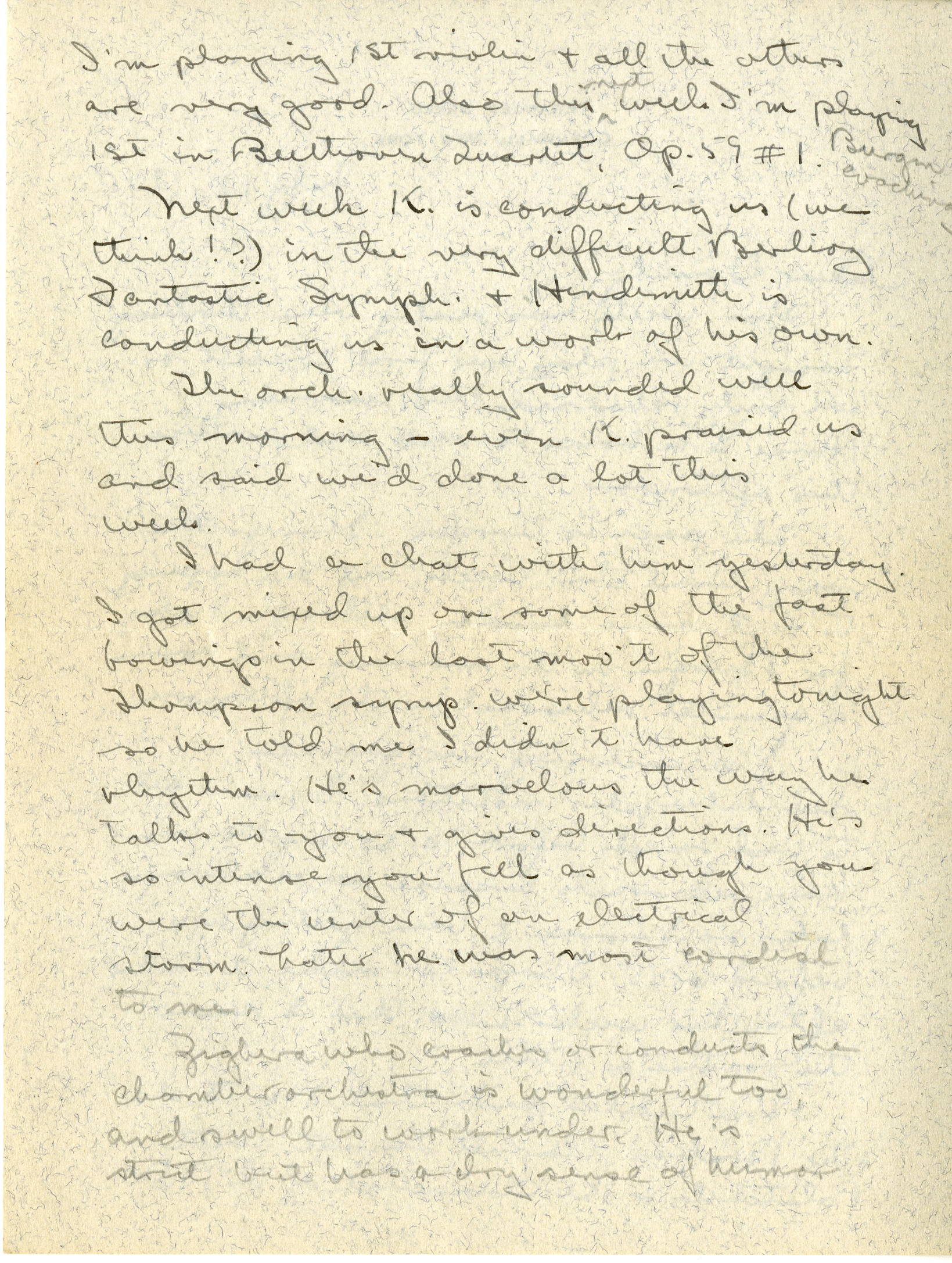 After playing for him I listened to the BSO for a while, had a string section rehearsal, an hour for lunch – at Johnson’s - with the Kripps [Krips] & Ariana [another student]; - full orch from 1:30 – 4; quintett [sic] with Burgin till 5:30, & from then on free. The Quintett [sic] went beautifully. It was really nice ensemble. Mon. we started working out the Mozart G min. for the chamber music concert Sat. afternoon – at which K. [Koussevitzky] is always present. I’m the poorest member of the group – the others are probably the most experienced chamber music players in the Institute. Burgin is coaching us but we are rehearsing as much as possible by ourselves too. The thing has to be good & [continued on page 3]