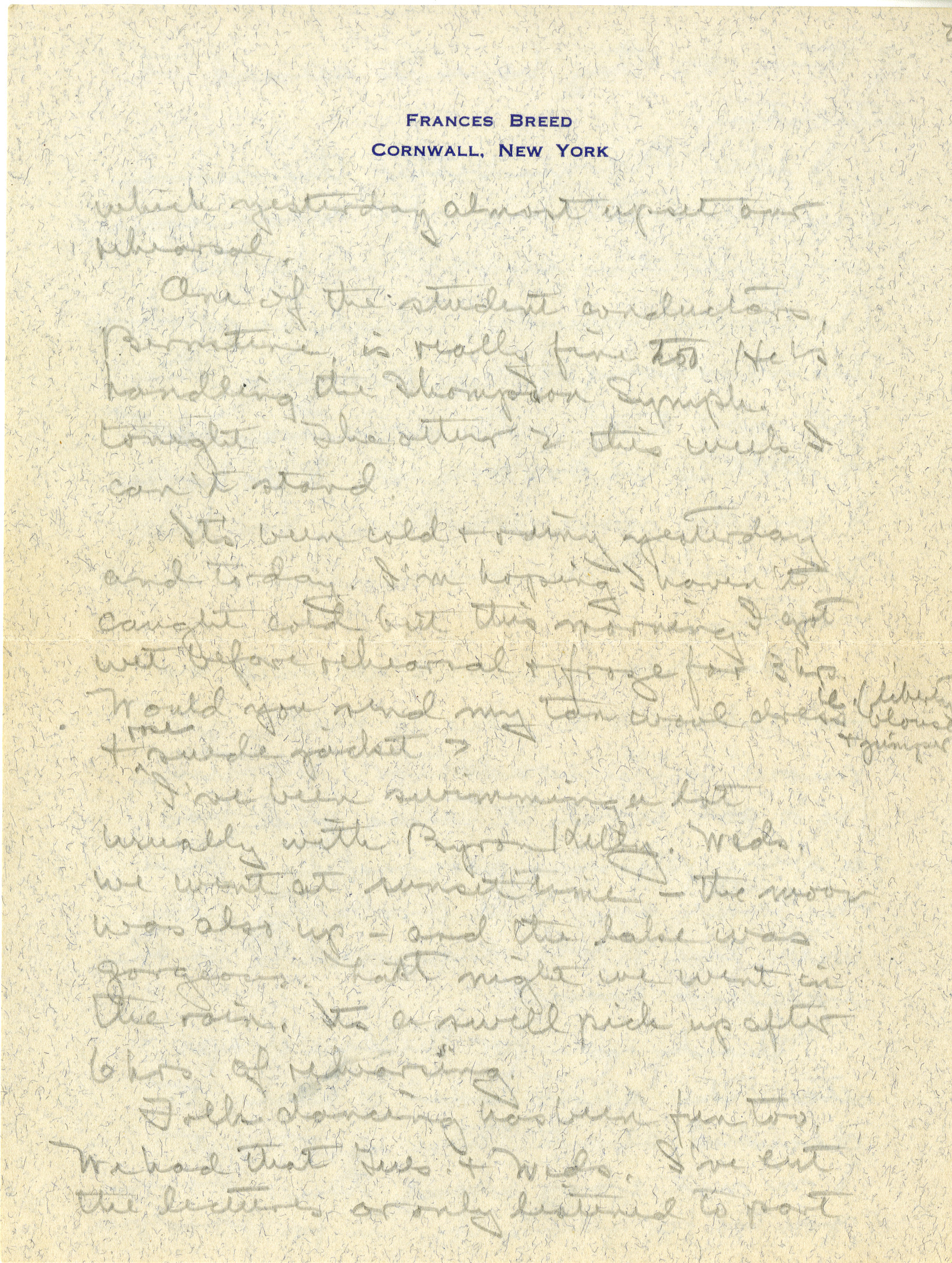 I’ve been swimming a lot usually with Byron Kelly [sic, Kelley, stage manager/assistant to Herbert Graf]. Wed. we went at sunset time – the moon was also up – and the lake was also up – and the lake was gorgeous. Last night we went in the rain. It’s a swell pick up after 6 hrs. of rehearsing.