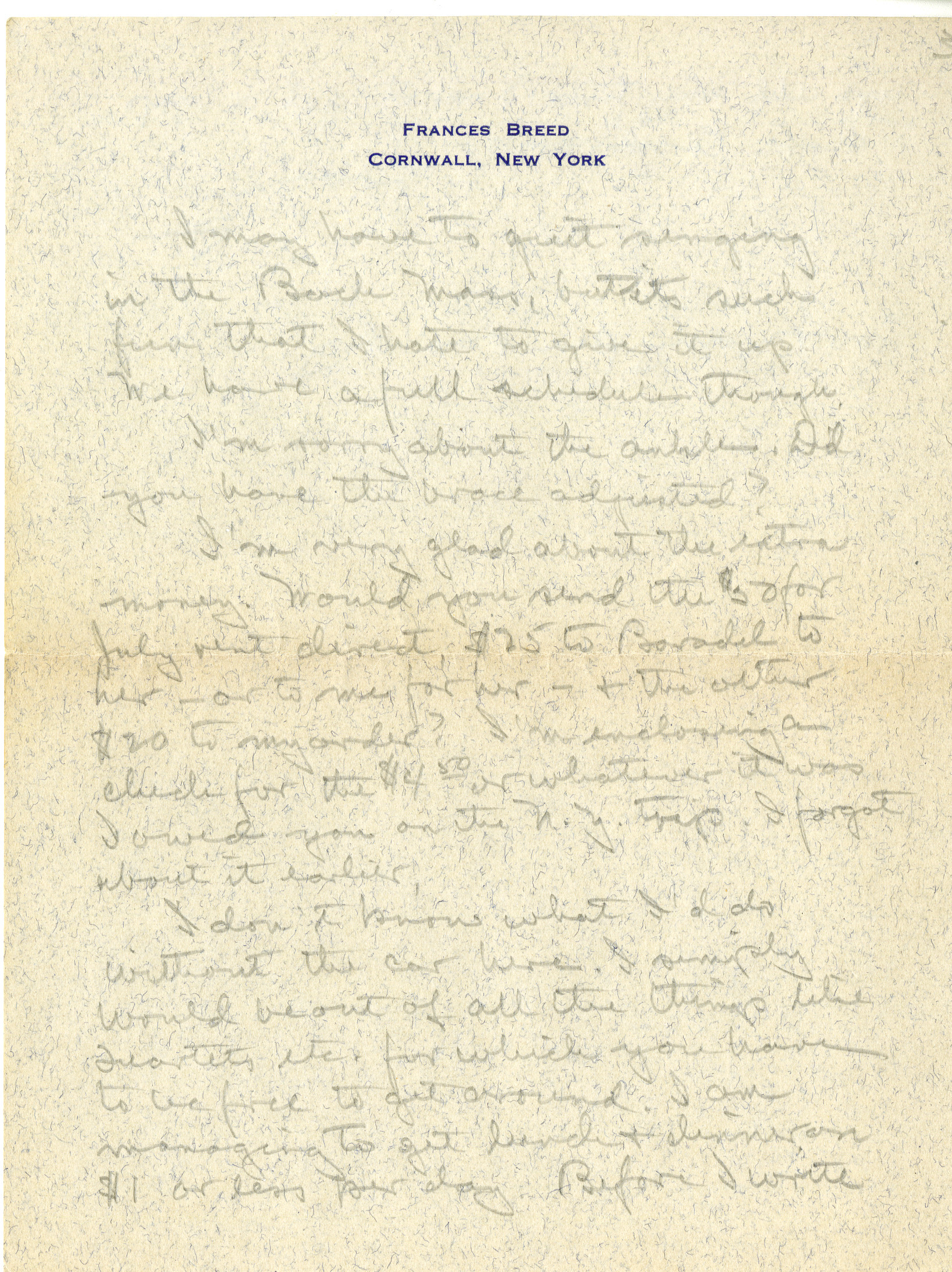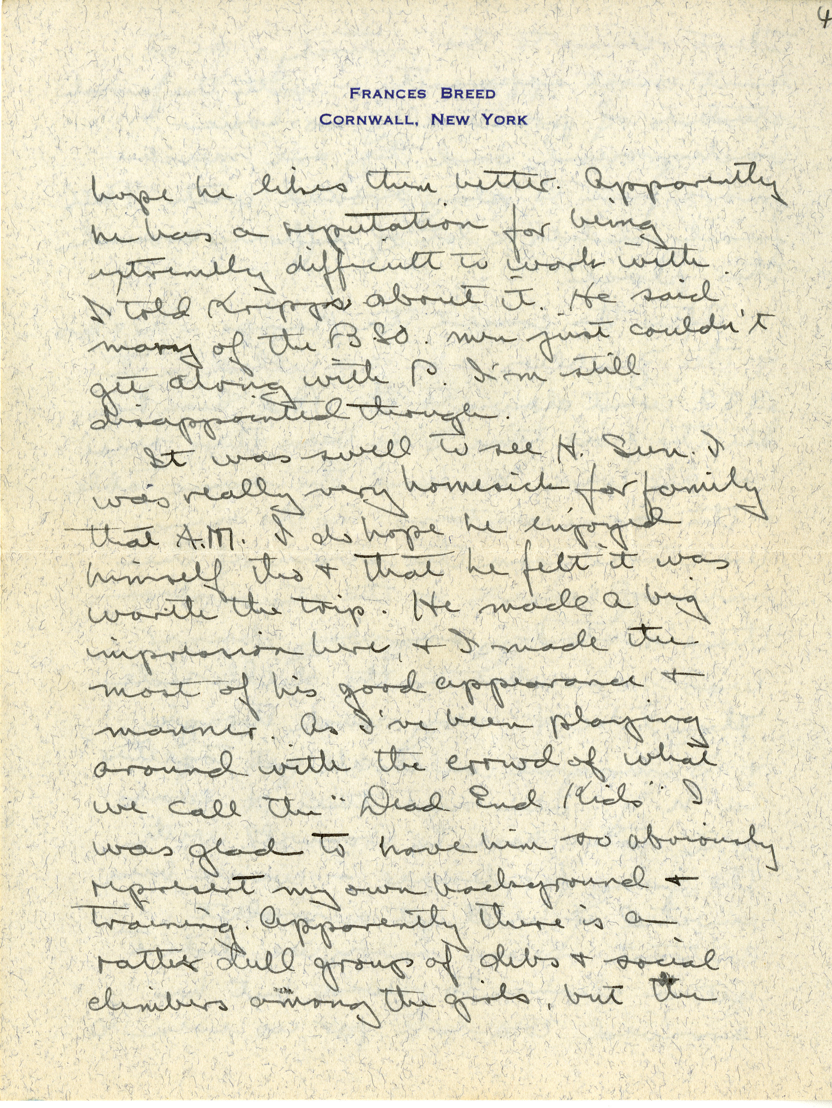 It was swell to see H. [Henry Breed, her brother] Sun. I was really very homesick for family that A.M. I do hope he enjoyed himself tho & that he felt it was worth the trip. He made a big impression here, & I made the most of his good appearance & manner. As I’ve been playing around with the crowd of what we call the “Dead End Kids” I was glad to have him so obviously represent my own background & training. Apparently there is a rather dull group of debs & social climbers among the girls, but the [continued on page 8]