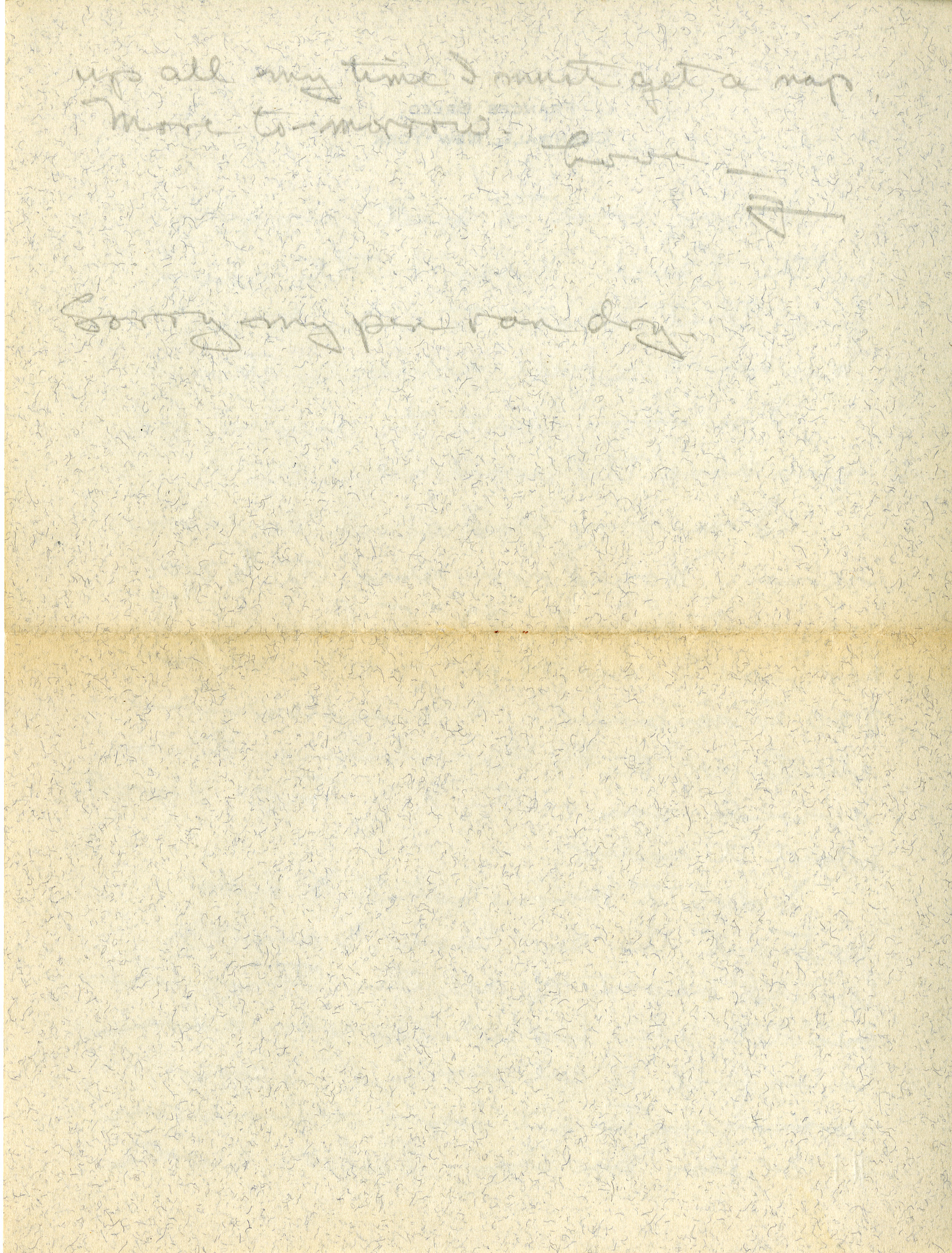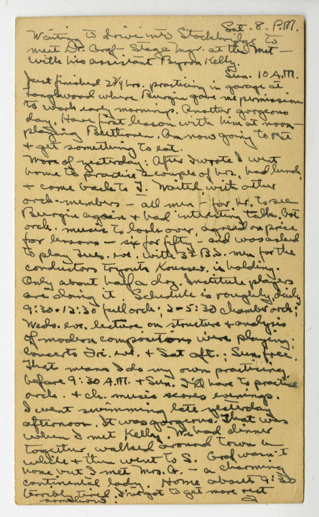 That means I do my own practicing before 9:30 A.M. & Sun. I’ll have to practice orch. & ch. music scores evenings. I went swimming late yesterday afternoon. It was gorgeous. That was when I met Kelly. We had dinner together walked around town a while & then went to S [Stockbridge?]. Graf wasn’t home but I met Mrs. Gr – a charming continental lady. Home about 9:30 terribly tired. I’ve got to get more rest somehow.