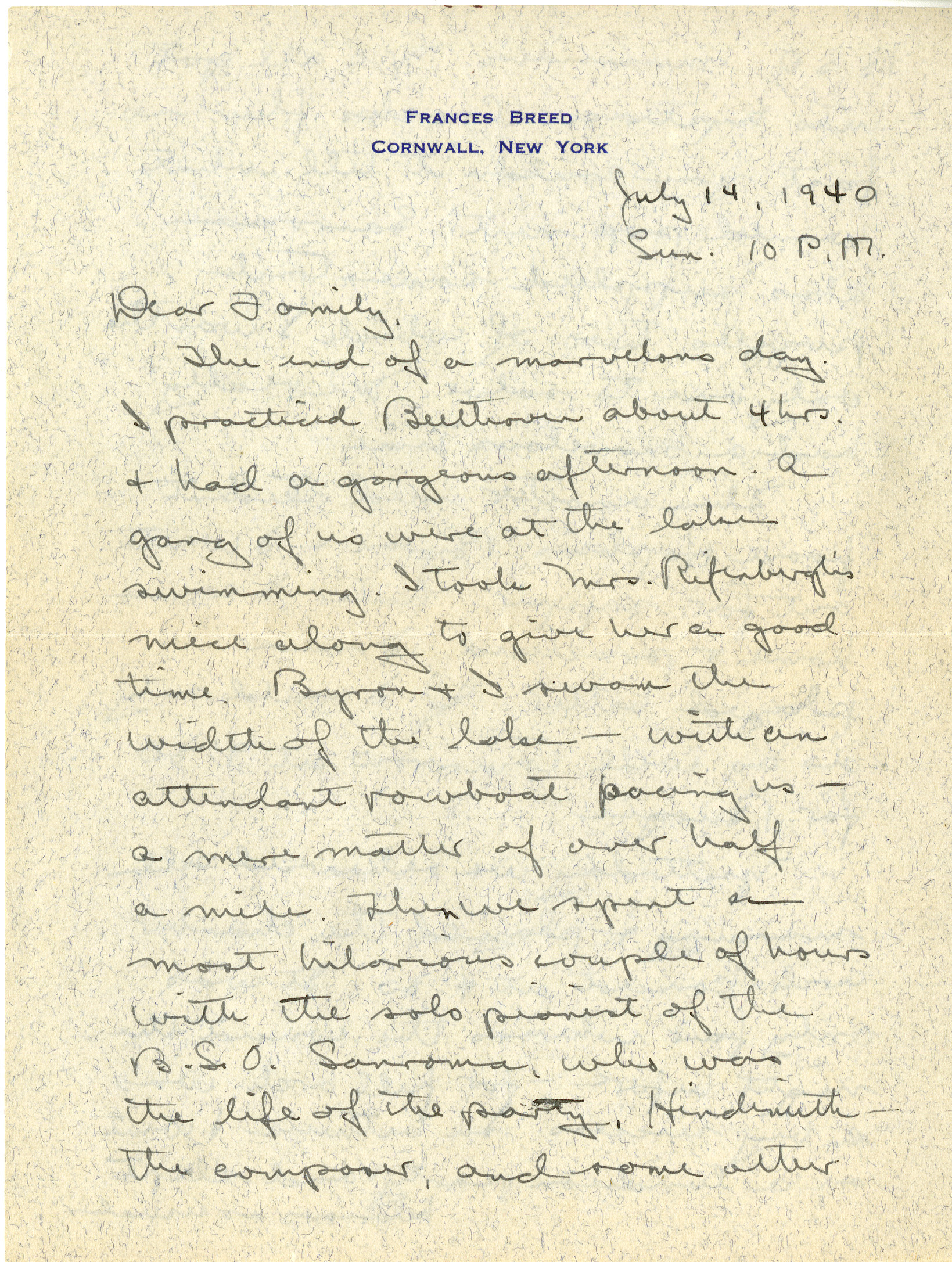 The end of a marvelous day. I practiced Beethoven about 4 hrs. & had a gorgeous afternoon. A gang of us were at the lake swimming. I took Mrs. Rifenburgh’s niece along to give her a good time. Byron & I swam the width of the lake – with an attendant rowboat pacing us – a mere matter of over half a mile. Then we spent a most hilarious couple of hours with the solo pianist of the B.S.O. Sanroma, who was the life of the party. Hindemith – the composer, and some other [continued on page 2]