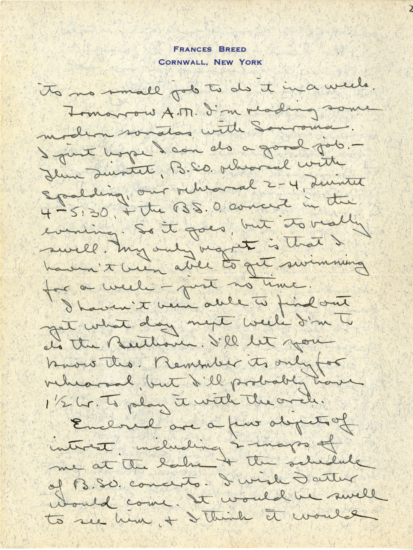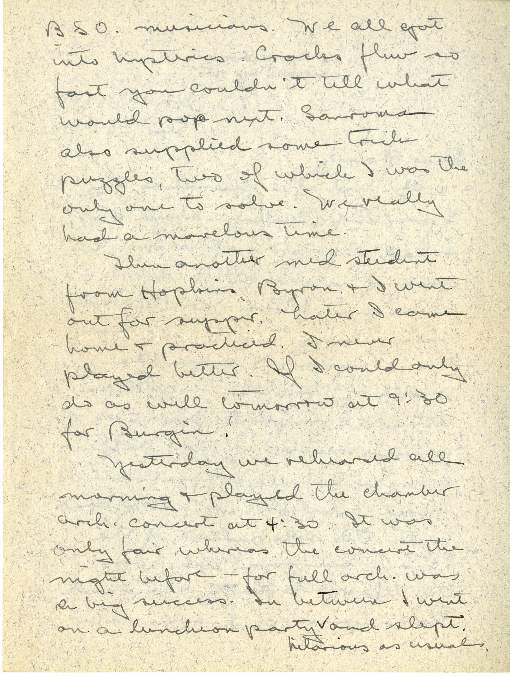 Tomorrow A.M. I’m reading some modern sonatas with Sanroma. I just hope I can do a good job. -Then Quintet [sic], B.S.O. rehearsal with Spalding, our rehearsal 2-4, Quintet 4-5:30, & the B.S.O. concert in the evening. So it goes, but its really swell. My only regret is that I haven’t been able to get swimming for a week – just no time.
