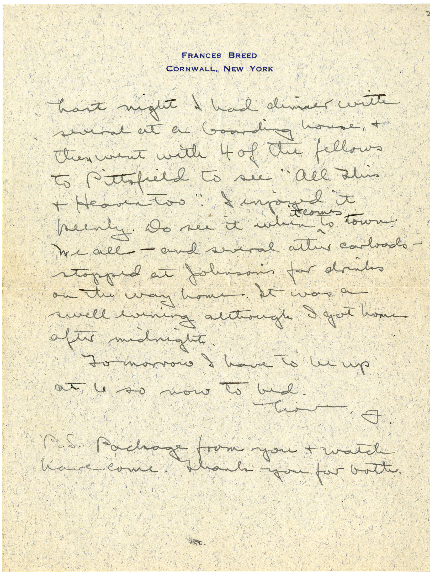 Last night I had dinner with several at a boarding house, & then went with 4 of the fellows to Pittsfield to see “All This & Heaven Too”. I enjoyed it keenly. Do see it when it comes to town. We all – and several other carloads – stopped at Johnson’s for drinks on the way home. It was a swell evening although I got home after midnight.