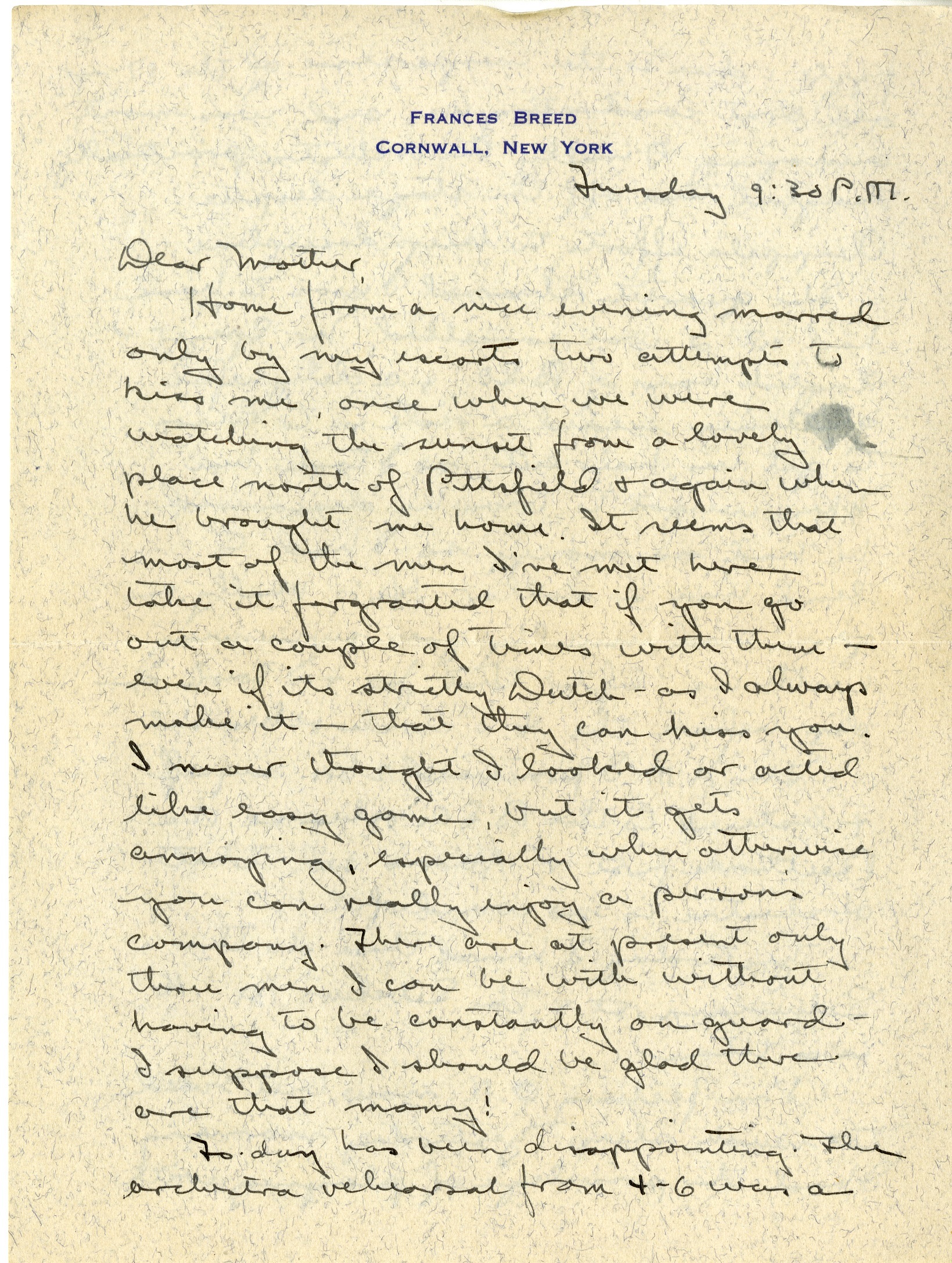 Home from a nice evening marred only by my escorts [sic] two attempts to kiss me, once when we were watching the sunset from a lovely place north of Pittsfield & again when he brought me home. It seems that most of the men I’ve met here take it for granted that if you go out a couple of times with them – even if its [sic] strictly Dutch – as I always make it – that they can kiss you. I never thought I looked or acted like easy game, but it gets annoying, especially when otherwise you can really enjoy a person’s company. There are at present only three men I can be with without having to be constantly on guard – I suppose I should be glad there are that many!