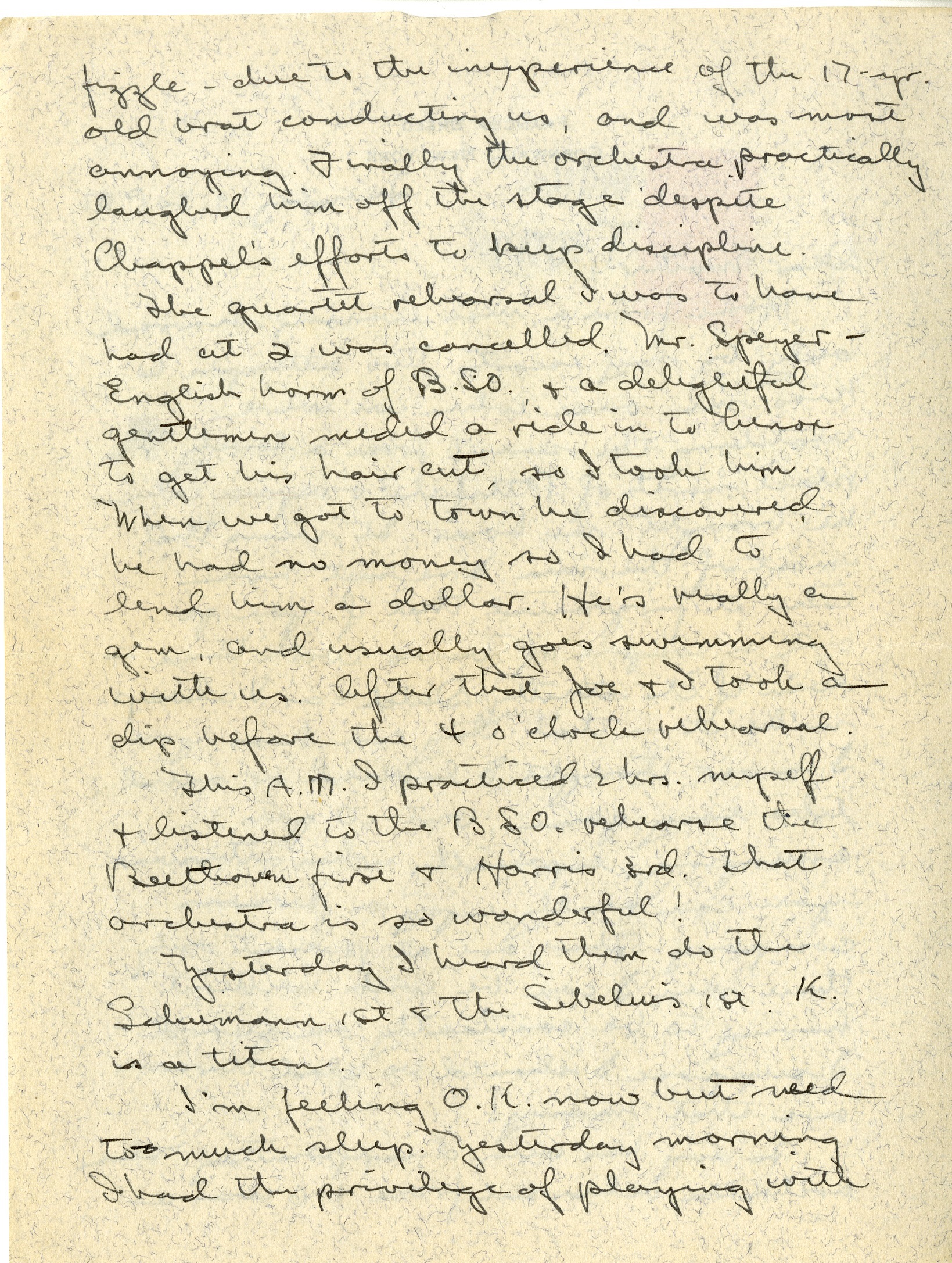 The quartet rehearsal I was to have had at 2 was cancelled. Mr. Speyer – English horn of B.S.O., & a delightful gentleman needed a ride in to Lennox to get his hair cut, so I took him. When we got to town he discovered he had no money so I had to lend him a dollar. He’s really a gem, and usually goes swimming with us. After that Joe & I took a dip before the 4 o’clock rehearsal.