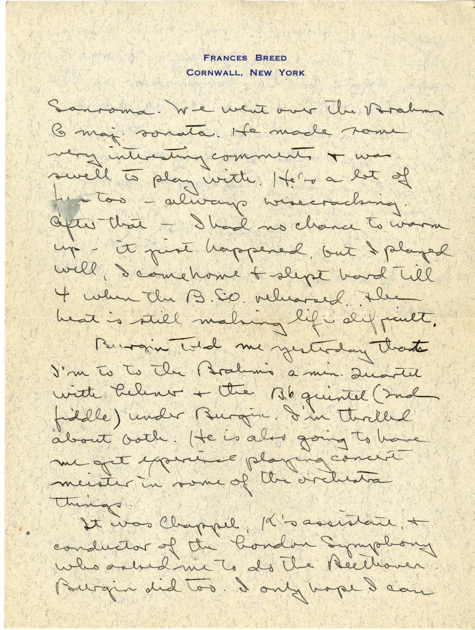Frances enthusiastically describes her initial meeting with BSO concertmaster Richard Burgin and the opportunities that await her this summer, but is confronted with a grueling schedule.