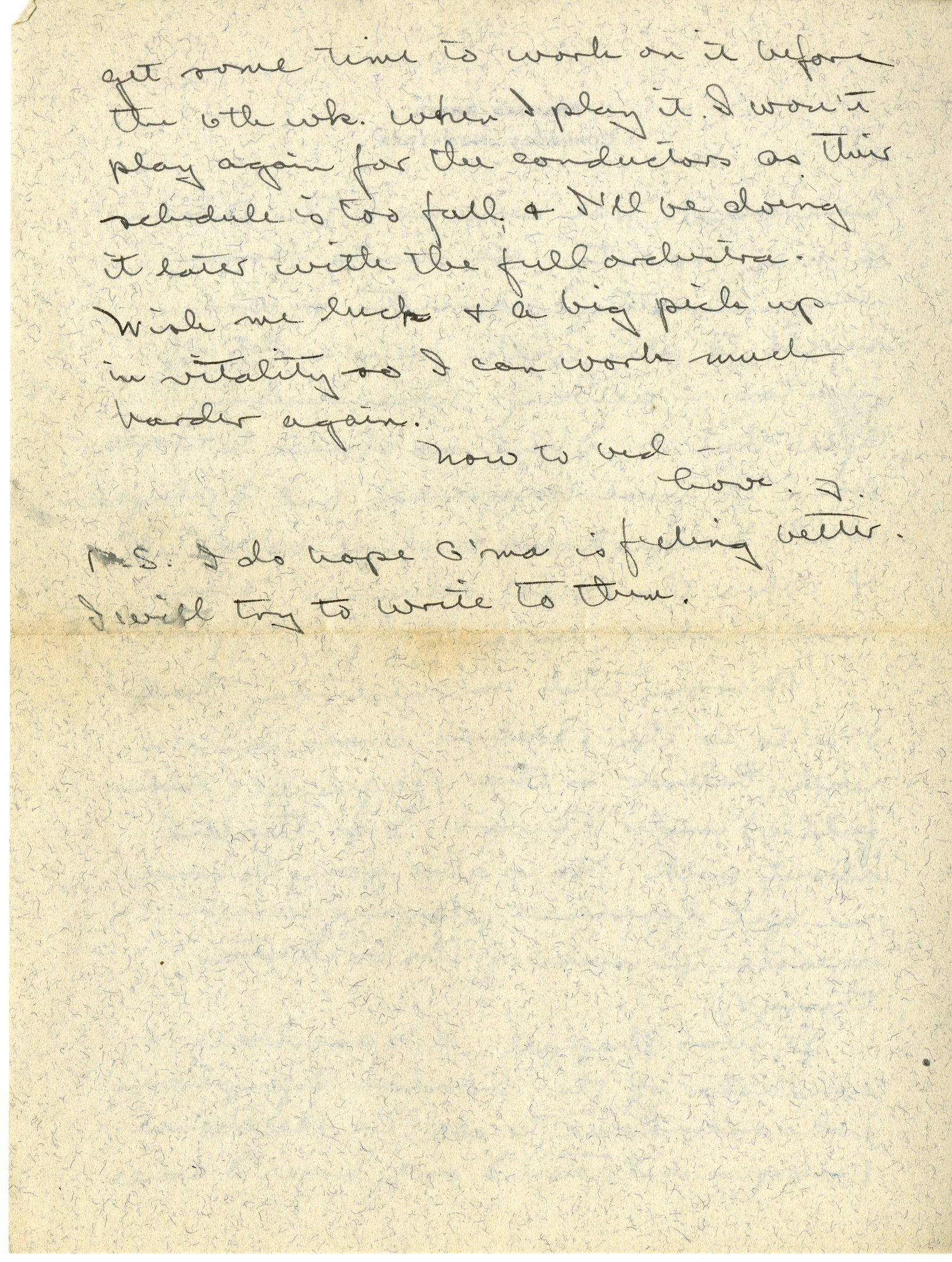 I haven’t been able to find out yet what day next week I’m to do the Beethoven. I’ll let you know tho. Remember its only for rehearsal, but I’ll probably have 1 ½ hr to play it with the orch.
