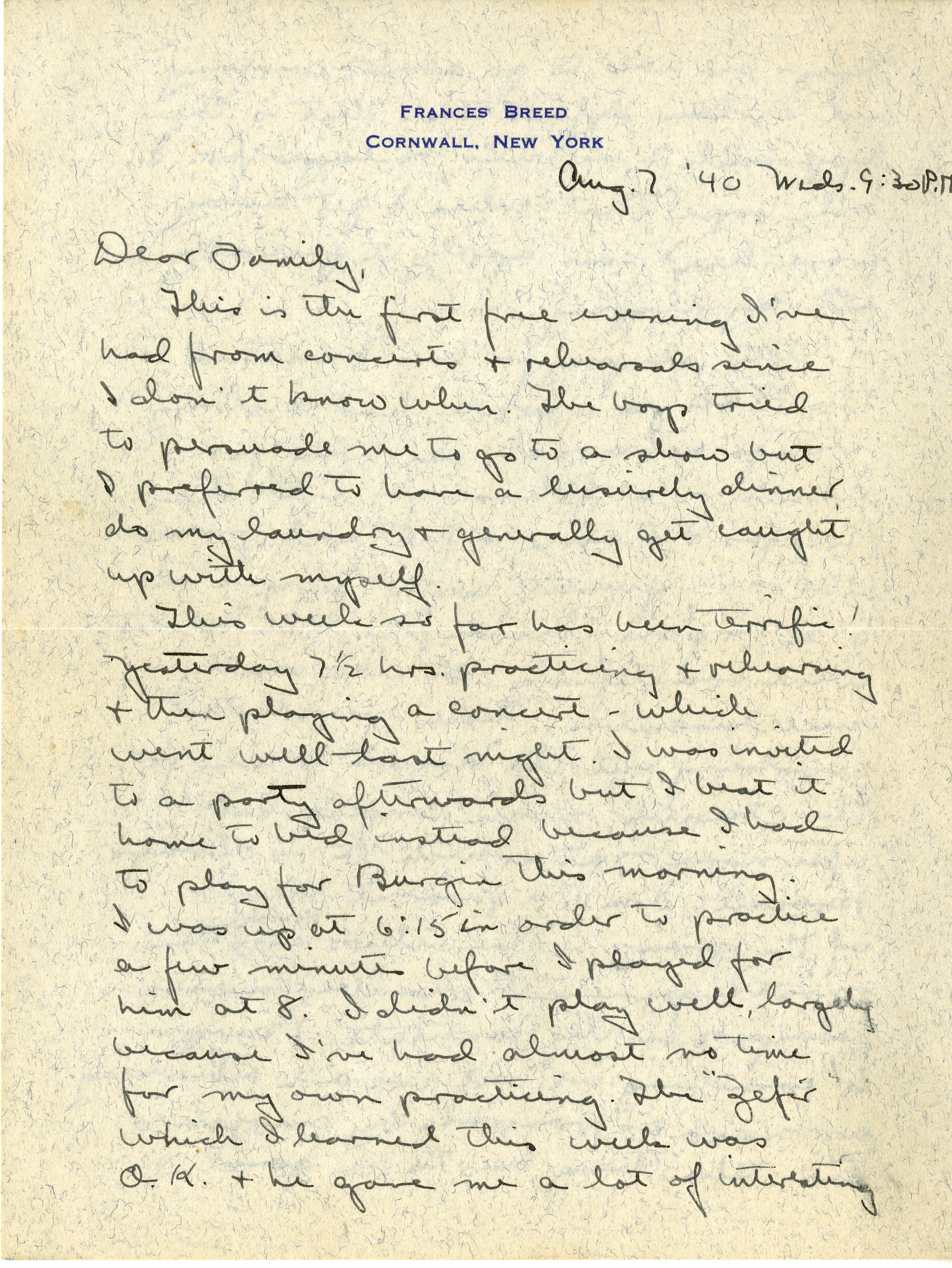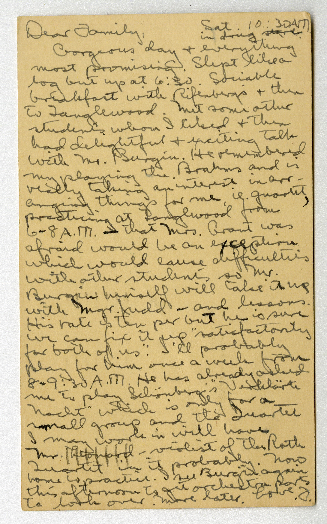 Gorgeous day & everything most promising. Slept like a log but up at 6:30. Sociable breakfast with Rifenbergs & then to Tanglewood. Met some other students whom I liked & then had delightful & exciting talk with Mr. Burgin. He remembered my playing the Brahms and is really taking an interest in arranging things for me, i.e. quartet, practicing at Tanglewood from 6-8 A.M. - that Mrs. Grant [Music Center secretary] was afraid would be an exception which would cause difficulties with other students so Mr. Burgin himself will take it up with [BSO] Mgr. Judd - and lessons. His rate is ten per but he is sure we can fix it up “satisfactorily for both of us.” I’ll probably play for him once a week from 8 – 9:30 A.M. He has already asked me to play Schonberg’s “Verklärte Nacht” which is only for a small group and the Quartet I may work in will have Mr. [Leonard? Scratched out] - violist of the Roth Quartet in it probably. Now home to practice. I see Burgin again this afternoon to get orchestra parts to look over. More later.