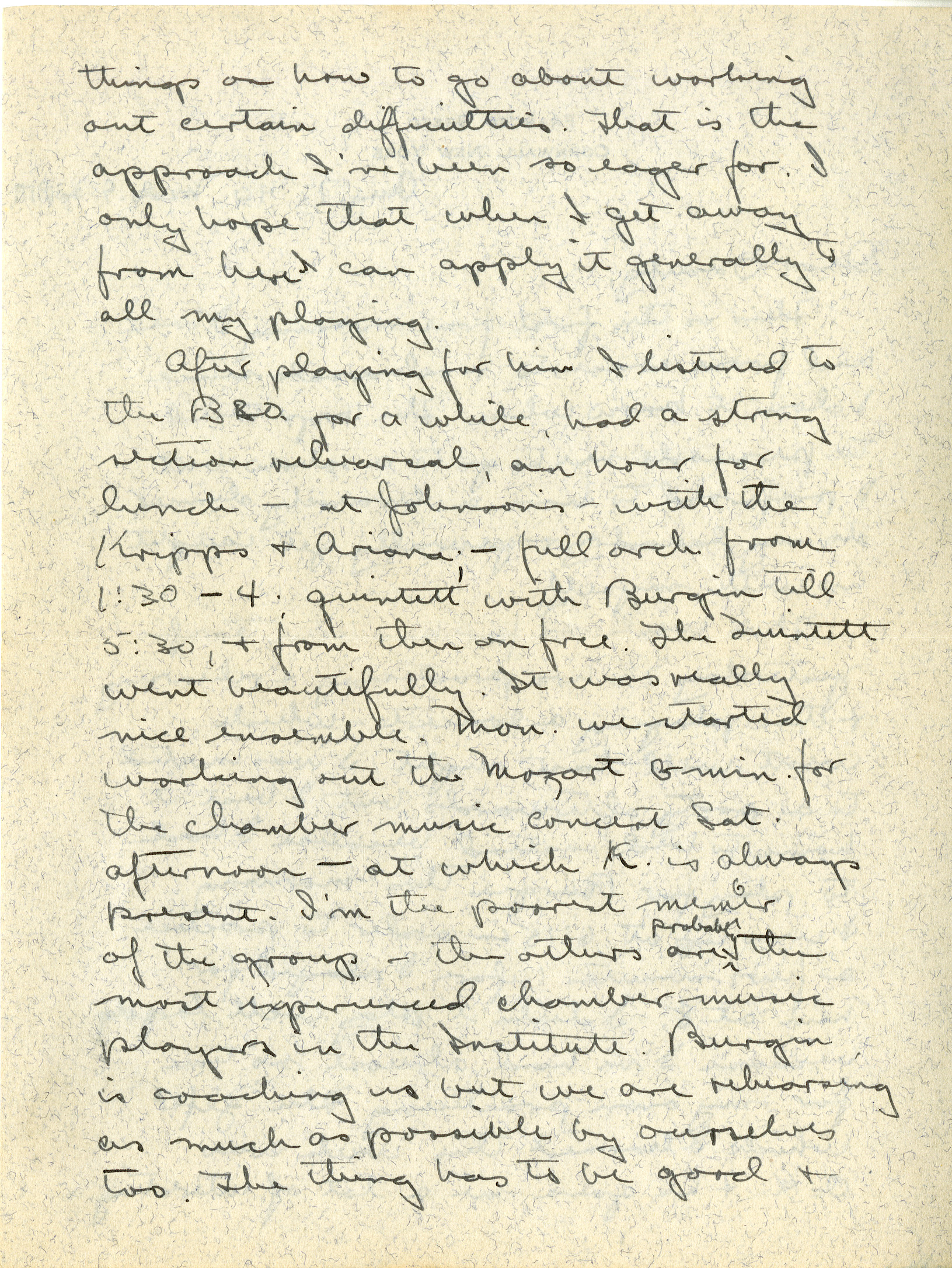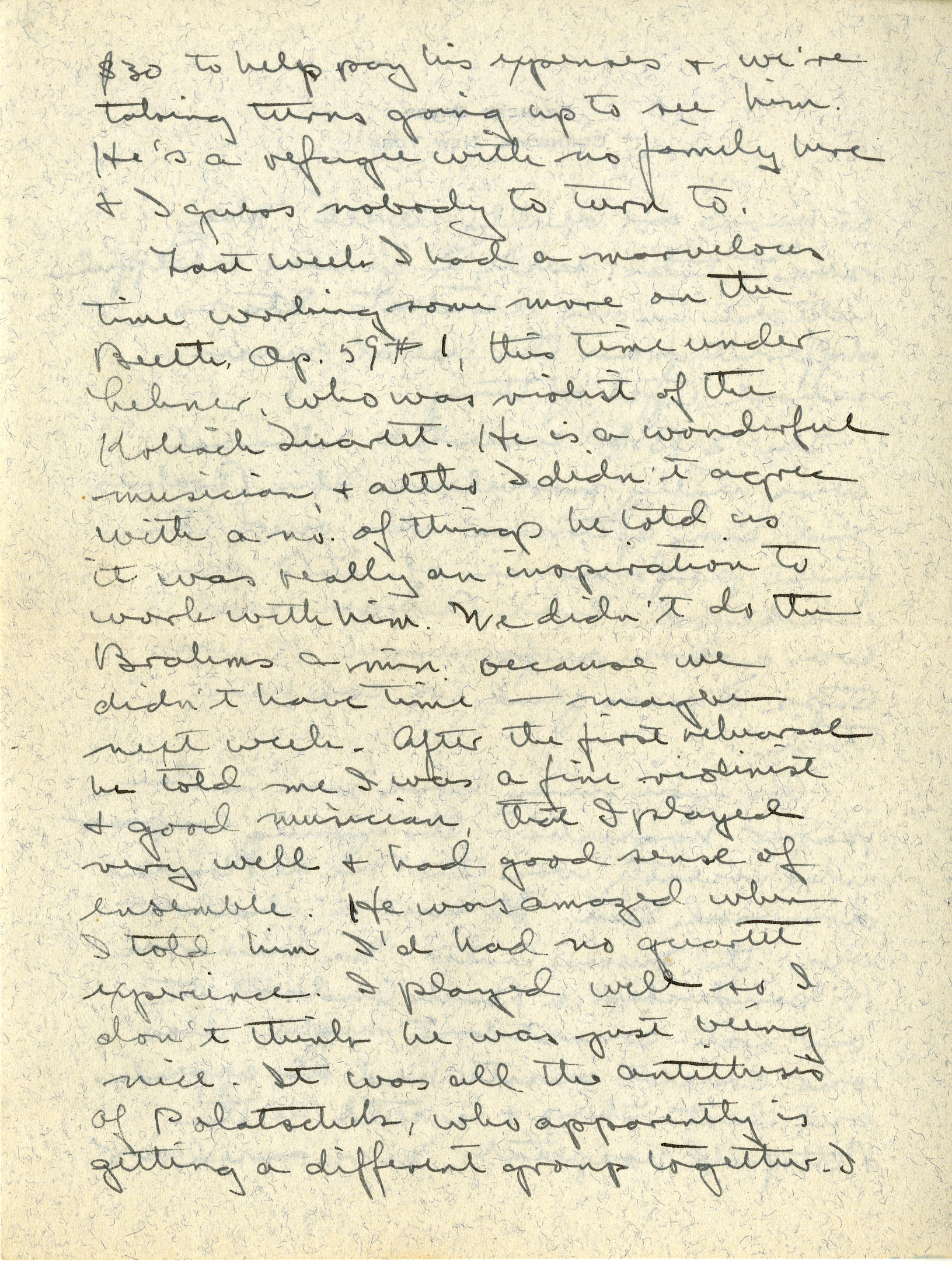 Last week I had a marvelous time working some more on the Beeth. Op. 59 #1, this time under Lehner [Eugen Lehner], who was violist of the Kolisch Quartet. He is a wonderful musician, & altho I didn’t agree with a no. of things he told us it was really an inspiration to work with him. We didn’t do the Brahms a min. because we didn’t have time – maybe next week. After the first rehearsal he told me I was a fine violinist & good musician, that I played very well & had good sense of ensemble. He was amazed when I told him I’d had no quartet experience. I played well so I don’t think he was just being nice. It was all the antithesis of Polatschek who apparently is getting a different group together. I [continued on page 7]