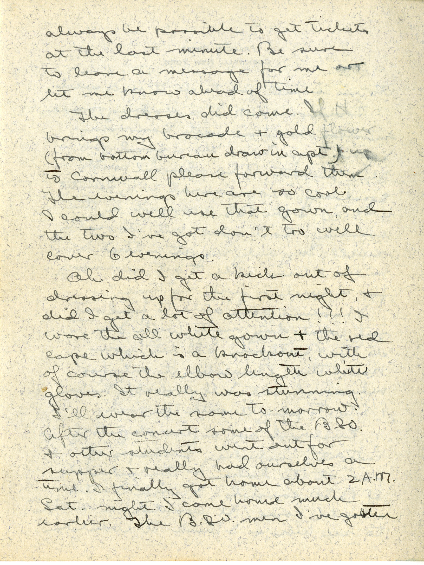 Oh did I get a kick out of dressing up for the first night, & did I get a lot of attention!!! I wore the all white gown & the red cape which is a knockout, with of course the elbow length white gloves. It really was stunning. I’ll wear the same tomorrow. After the concert some of the B.S.O. & other students went out for supper & really had ourselves a time. I finally got home about 2 A.M. Sat. night I came home much earlier. The B.S.O. men I’ve gotten [continued on page 5]