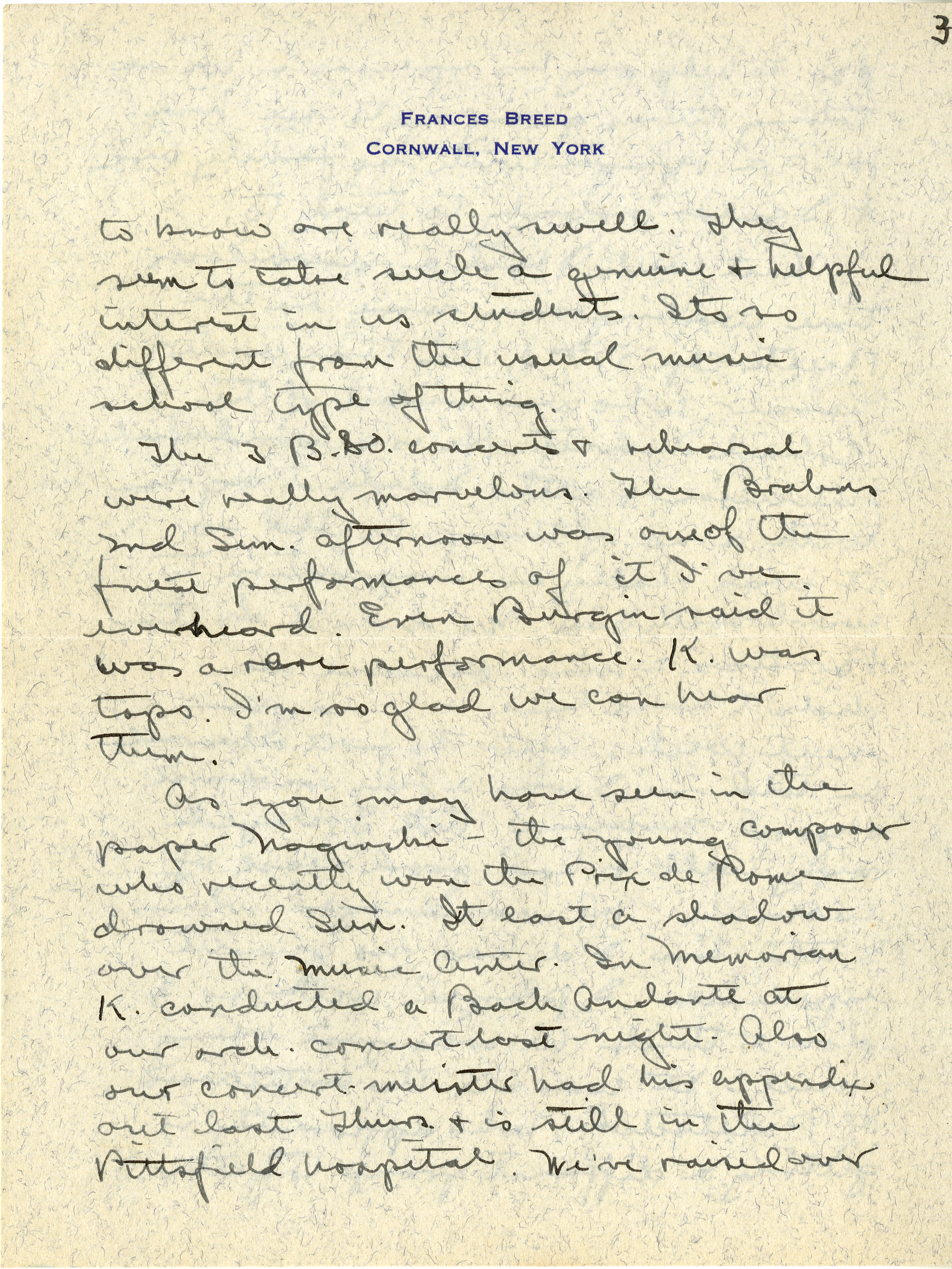 As you may have seen in the paper Naginski [Charles Naginski, another student] - the young composer who recently won the Prix de Rome drowned Sun. It cast a shadow over the Music Center. In Memoriam K. conducted a Bach Andante at our orch. concert last night. Also our concertmeister had his appendix out last Thurs & is still in the Pittsfield hospital. We’ve raised over [continued on page 6]