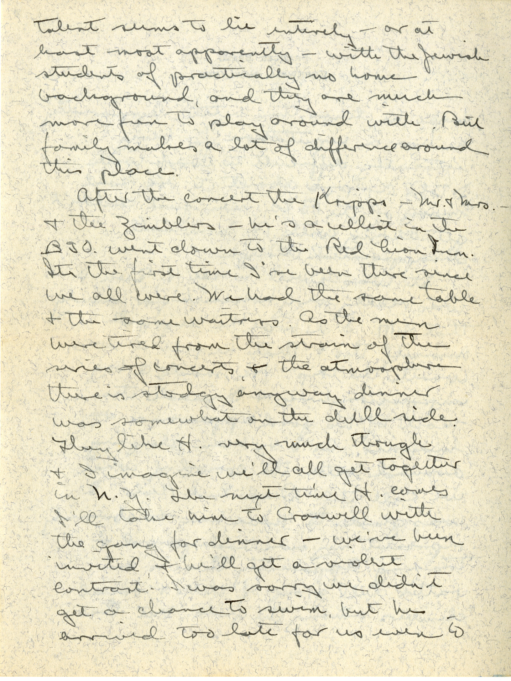 After the concert the Kripps [Krips] – Mr. & Mrs. – & the Zimblers – he's a cellist in the B.S.O. went down to the Red Lion Inn. Its the first time I’ve been there since we all were. We had the same table & the same waitress. As the men were tired from the strain of the series of concerts, & the atmosphere there is stodgy anyway dinner was somewhat on the dull side. They like H. very much though & I imagine we’ll all get together in N.Y. The next time H. comes I’ll take him to Cranwell with the gang for dinner – we've been invited, & he’ll get a violent contrast. I was sorry we didn’t get a chance to swim, but he arrived too late for us even to [continued on page 9]