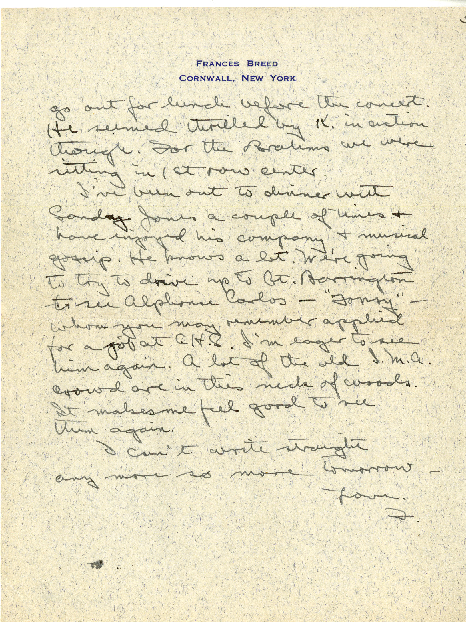 I’ve been out to dinner with Sandy Jones a couple of times & have enjoyed his company & musical gossip. He knows a lot. We’re going to try to drive up to Gt. Barrington to see Alphonse Carlos - “Fonsy” - whom you may remember applied for a job at C.H.S. I’m eager to see him again. A lot of the old I.M.A. crowd are in this neck of woods. It makes me feel good to see them again.