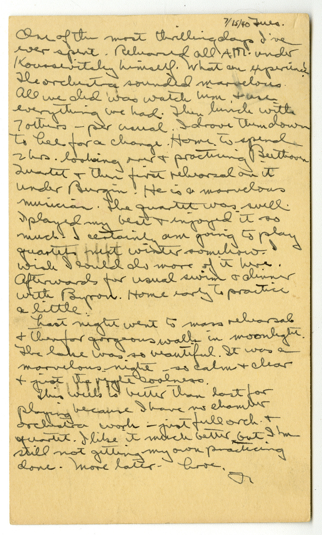 One of the most thrilling days I’ve ever spent. Rehearsed all A.M. under Koussevitzky himself. What an experience! The orchestra sounded marvelous. All we did was watch him & use everything we had. Then lunch with 7 others – per usual. I drove them down to Lee for a change. Home to spend 2 hrs. looking over & practicing Beethoven Quartet & then first rehearsal on it under Burgin! He is a marvelous musician. The quartet was swell. I played my best & enjoyed it so much. I certainly am going to play quartets next winter somehow. Wish I could do more of it here. Afterwards for usual swim & dinner with Byron. Home early to practice a little.
