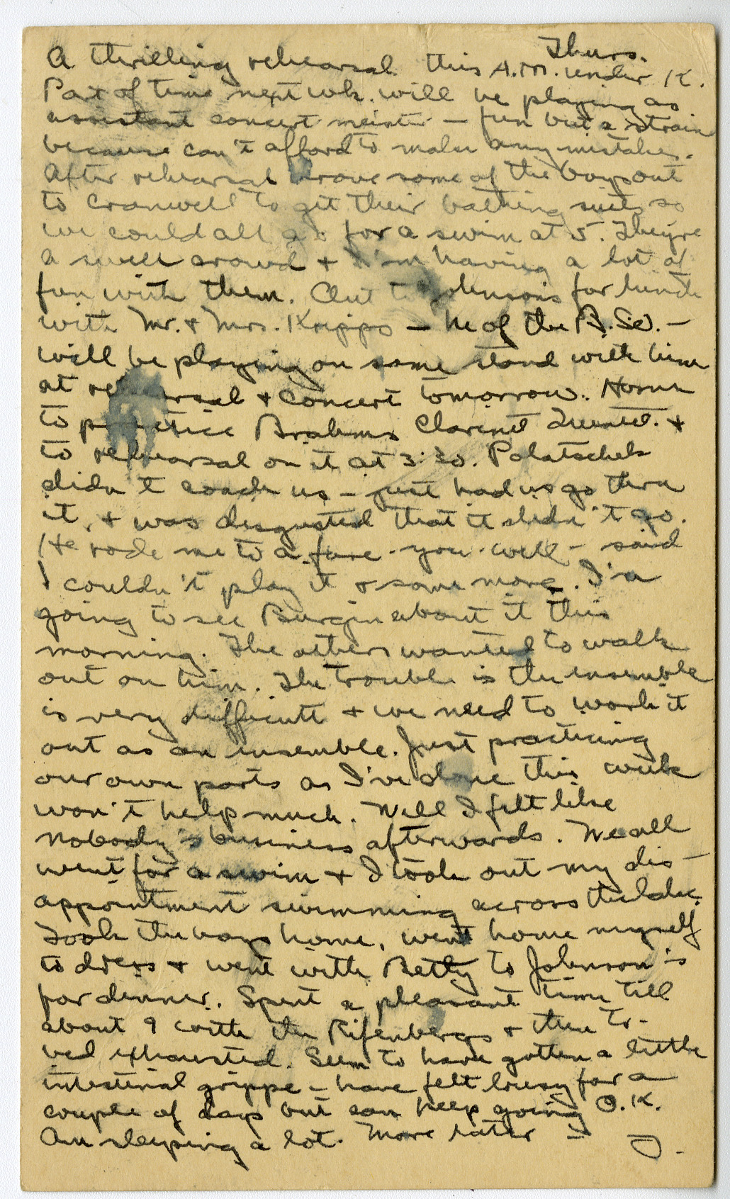 A thrilling rehearsal this A.M. under K [Koussevitzky]. Part of time next wk. will be playing as assistant concert master – fun but a strain because can’t afford to make any mistakes. After rehearsal drove some of the boys to Cranwell to get their bathing suits so we could all go for a swim at 5. They’re a swell crowd & I’m having a lot of fun with them. Out to Johnson’s for lunch with Mr. & Mrs. Kripps [Krips] - he of the B.S.O. - will be playing on same stand with him at rehearsal & concert tomorrow. Home to practice Brahms Clarinet Quintet & to rehearsal on it at 3:30. Polatschek didn’t coach us – just had us go thru it, & was disgusted that it didn’t go. He road me to a fare-you-well – said I couldn’t play it & some more. I’m going to see Burgin about it this morning. The others wanted to walk out on him. The trouble is the ensemble is very difficult & we need to work it out as an ensemble. Just practicing our own parts as I’ve done this week won’t help much. Well I felt like nobody’s business afterwards. We all went for a swim & I took out my disappointment swimming across the lake. I took the boys home, went home myself to dress & went with Betty to Johnson’s for dinner. Spent a pleasant time till about 9 with the Rifenbergs & then to bed exhausted. Seem to have gotten a little intestinal grippe – have felt lousy for a couple of days but can keep going O.K. Am sleeping a lot. More later