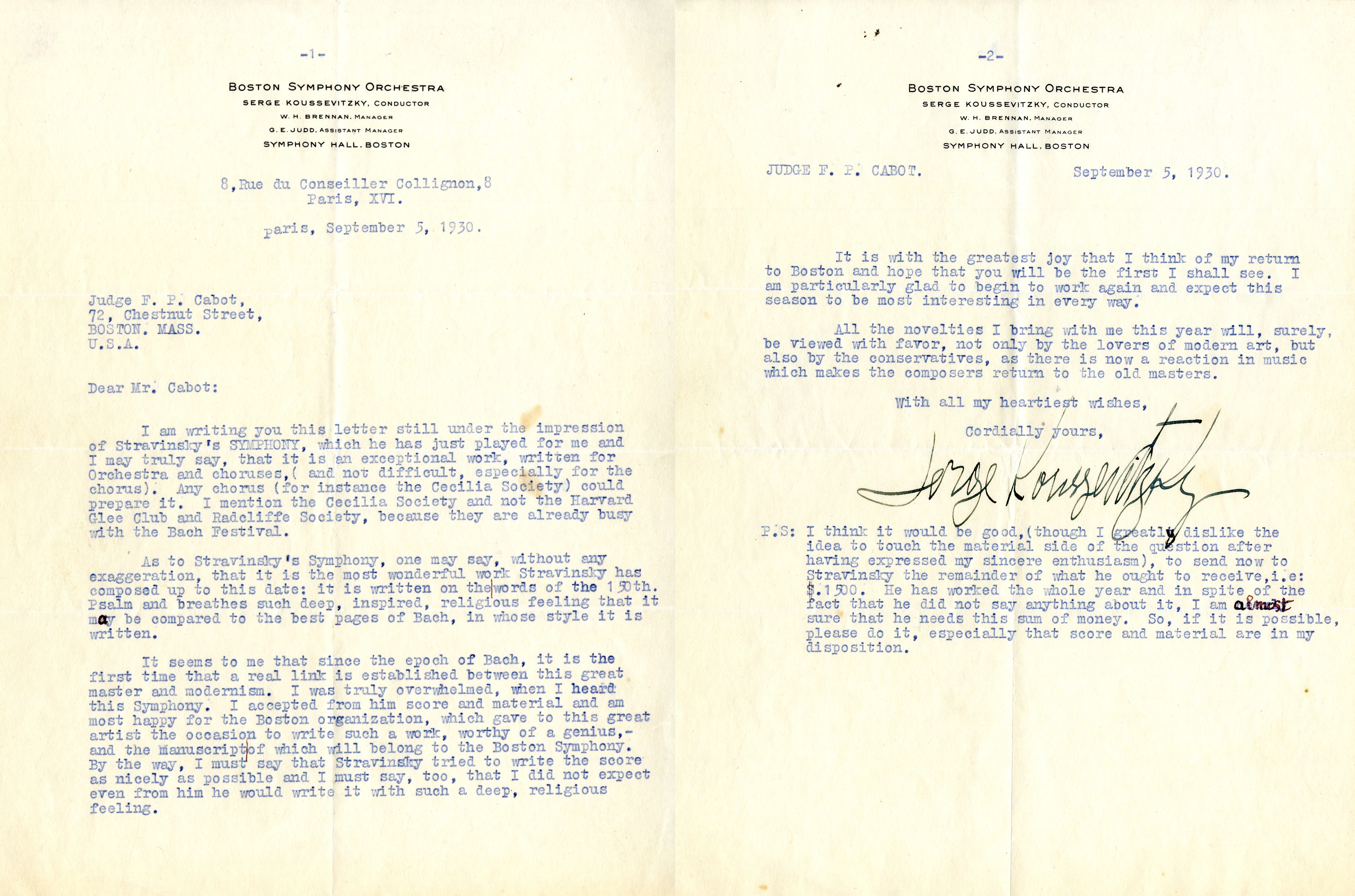 Letter from BSO Music Director Serge Koussevitzky to BSO President of the Trustees Frederick P. Cabot regarding Symphony of Psalms, dated September 5, 1930