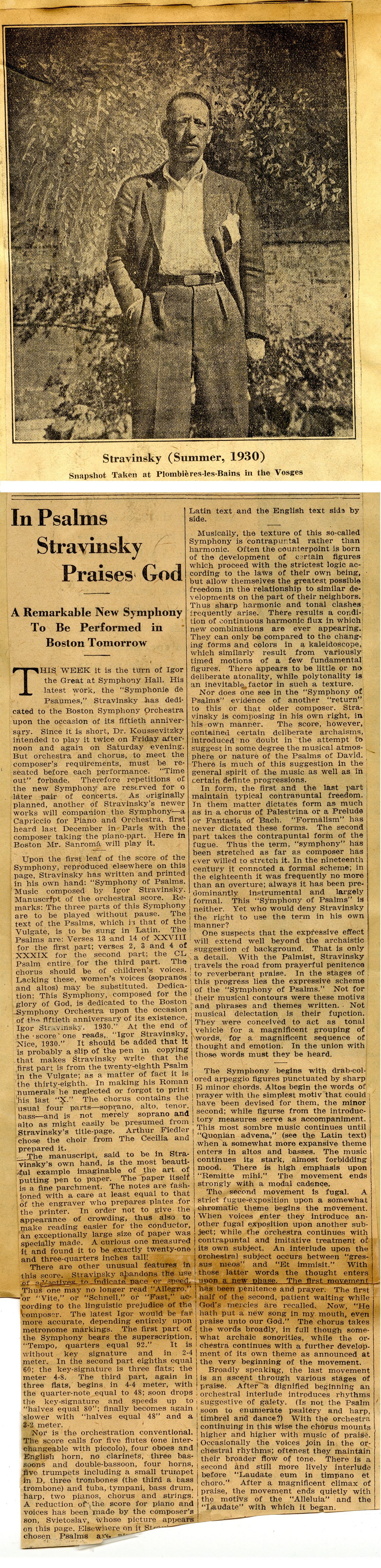 Newspaper clipping announcing the U.S. premiere of Stravinsky’s Symphony of Psalms