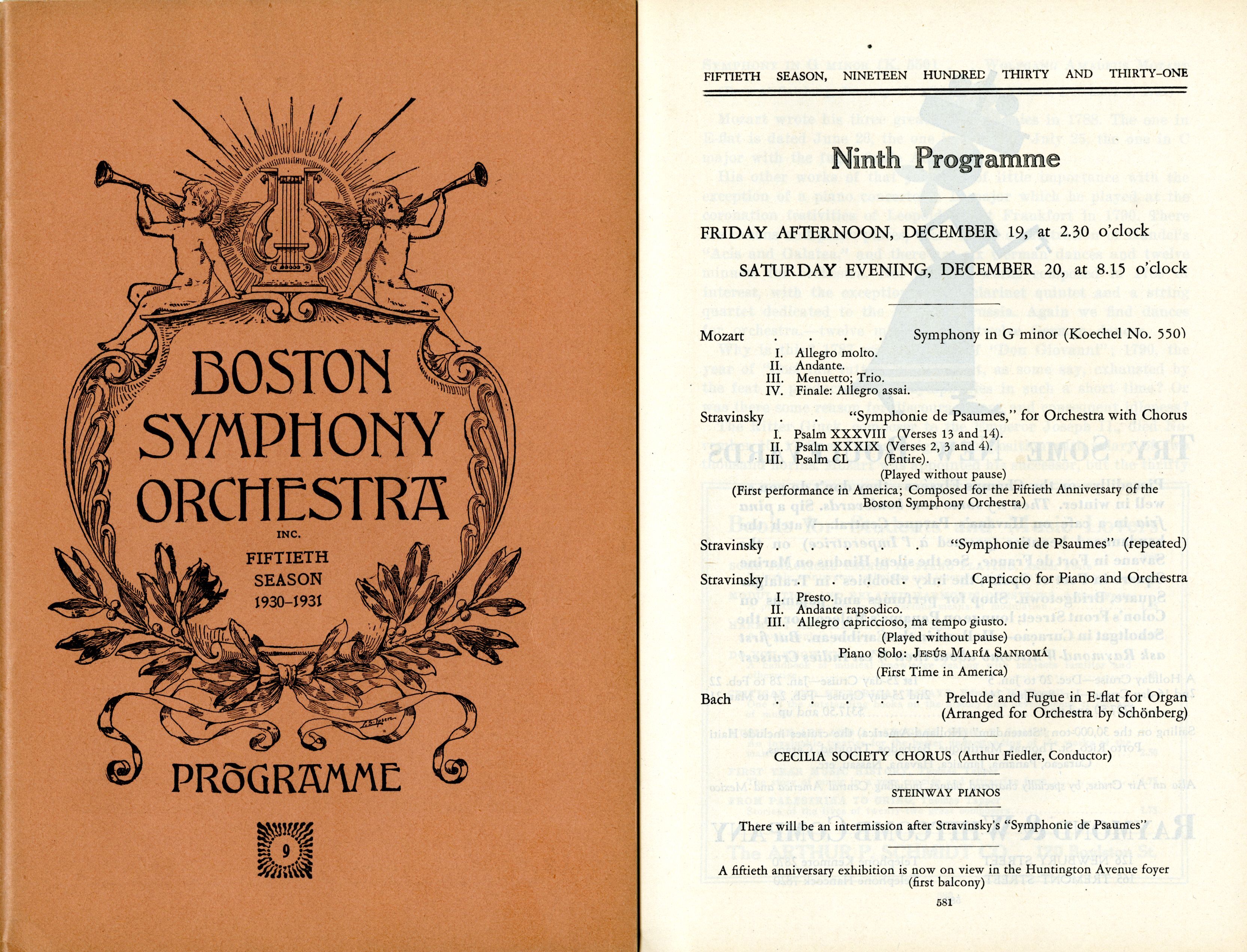 Note that not one but two Stravinsky works received their U.S. premieres on the December 19 and 20, 1930 pair of BSO concerts: the BSO commission Symphony of Psalms, and a Stravinsky’s Capriccio for Piano and Orchestra. Koussevitzky had intended to perform the Symphony of Psalms twice on the same program, but re-seating logistics for both orchestra and chorus caused him to discard the extra performance.