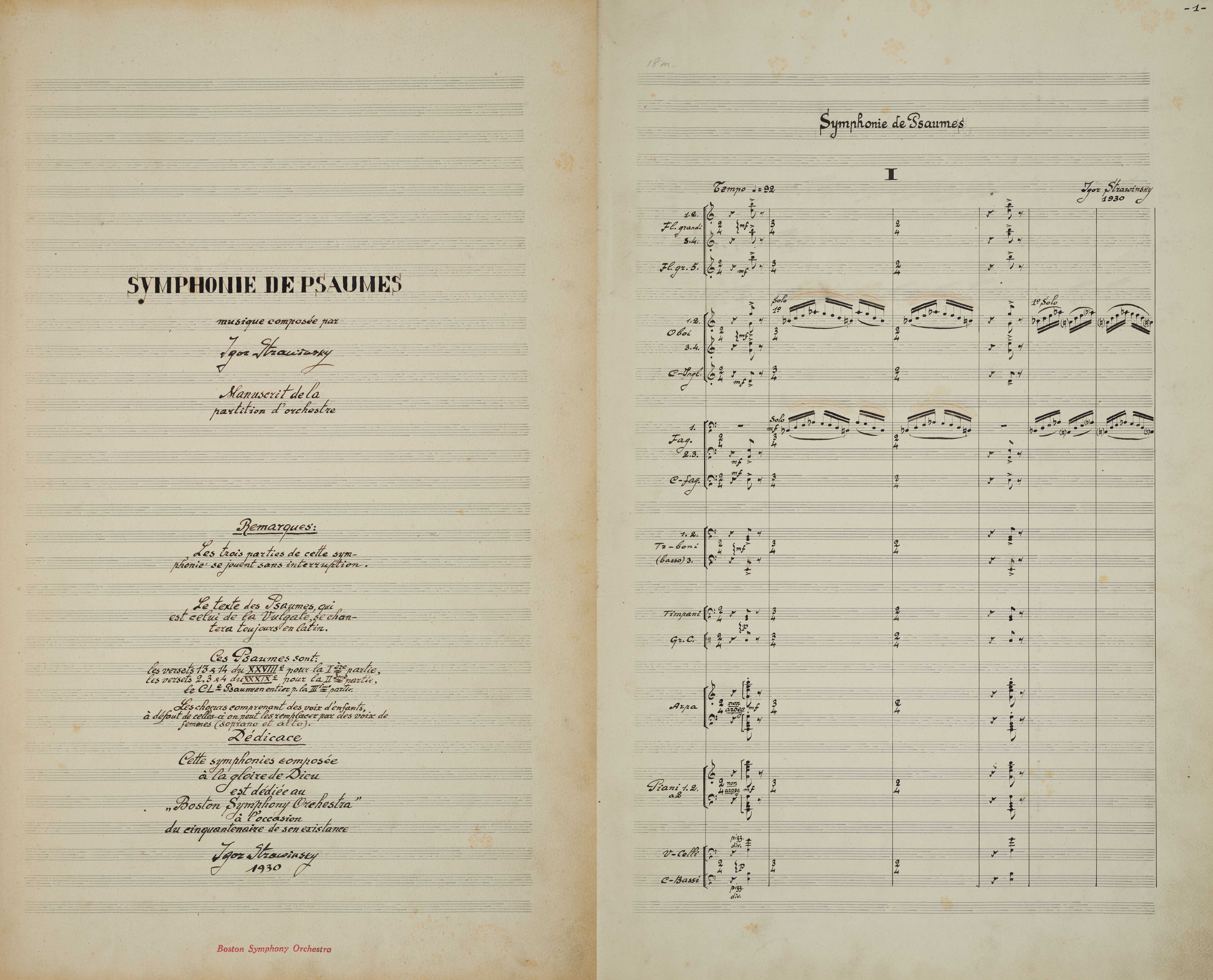 BSO score, with inscription, for Igor Stravinsky’s Symphony of Psalms, commissioned in honor of the BSO’s 50th anniversary season