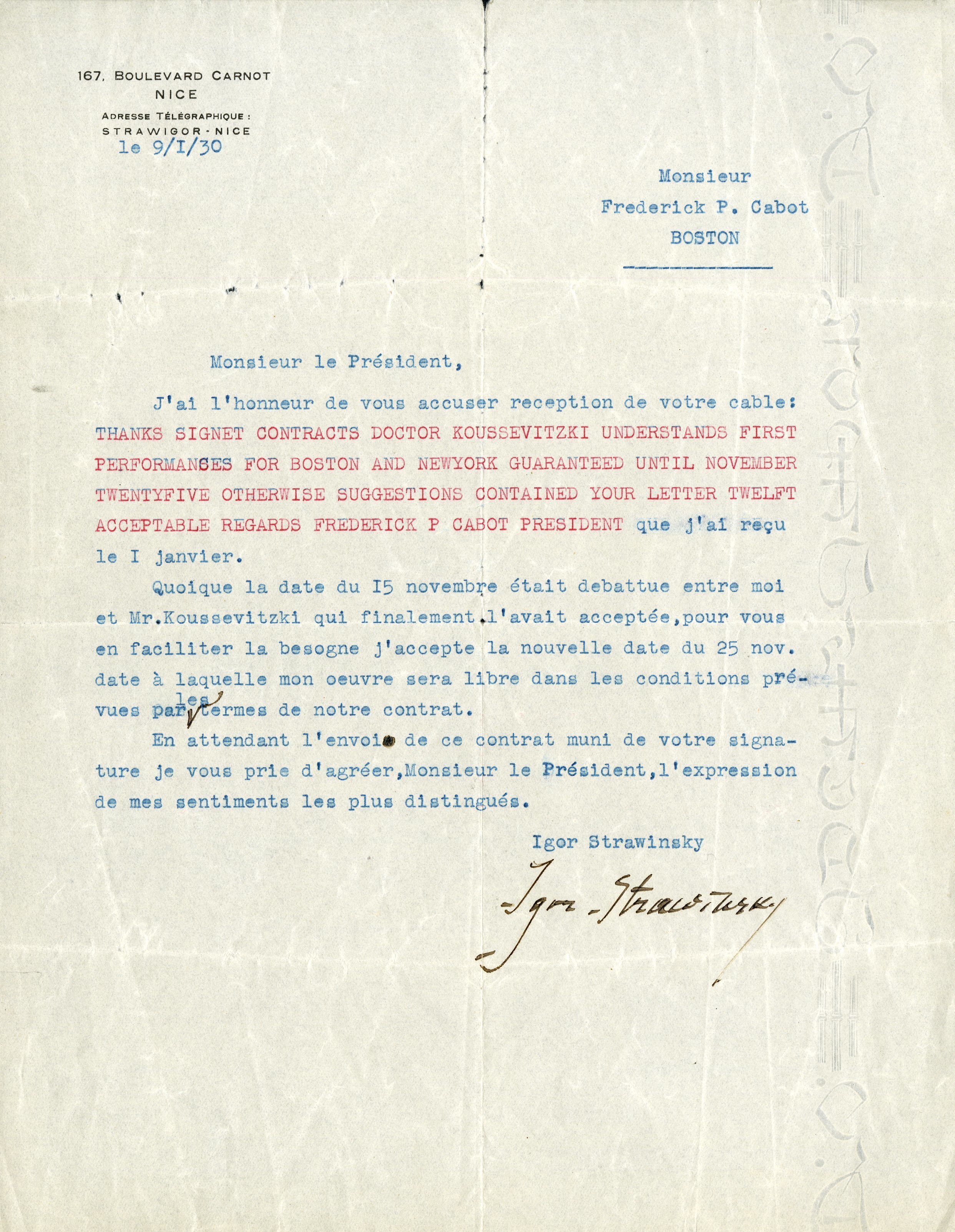 Letter from composer Igor Stravinsky to BSO President of the Trustees Frederick P. Cabot, January 9, 1930