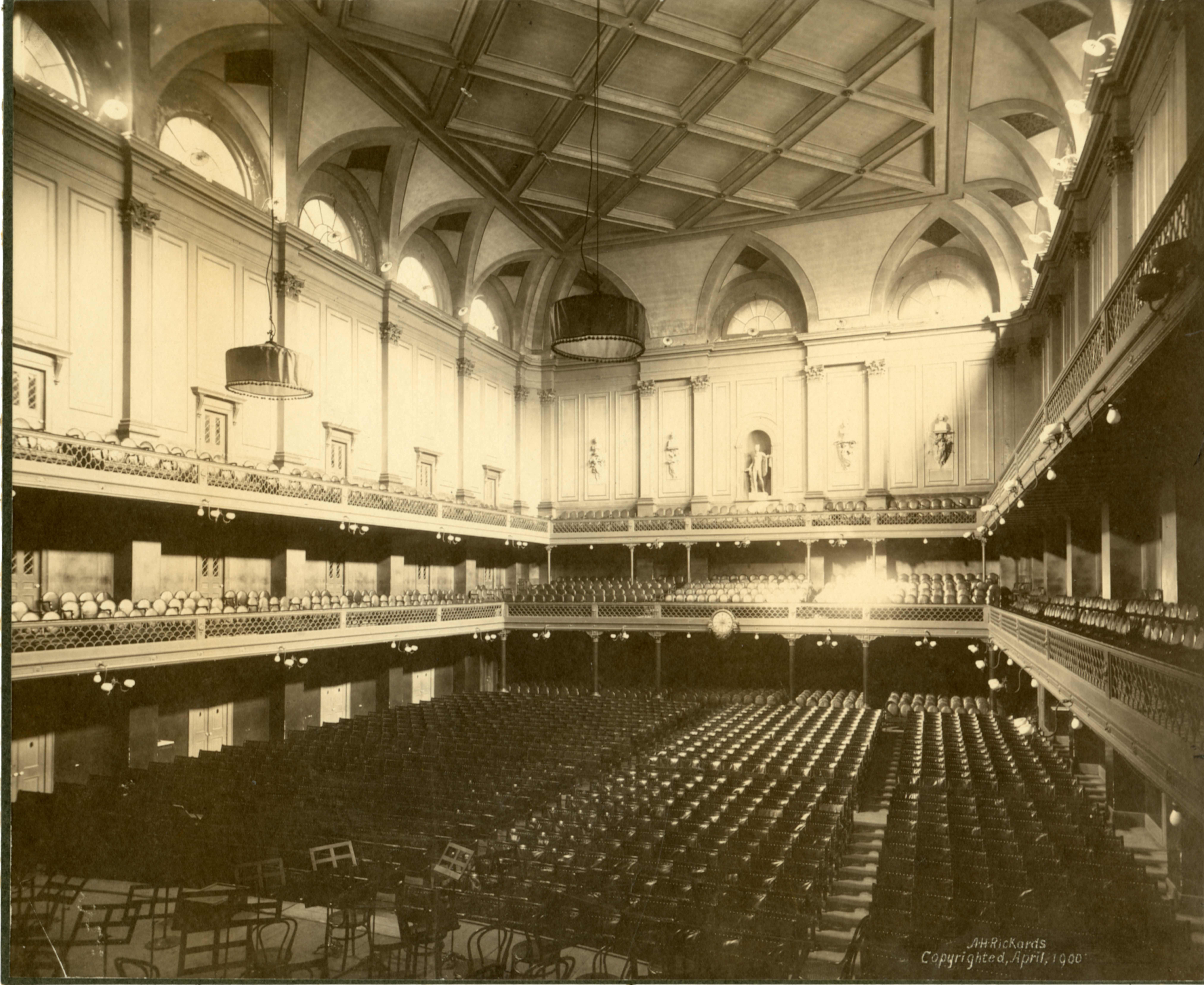 Interior view of Symphony Hall, ca. 1901, showing vacant niches and two with statues