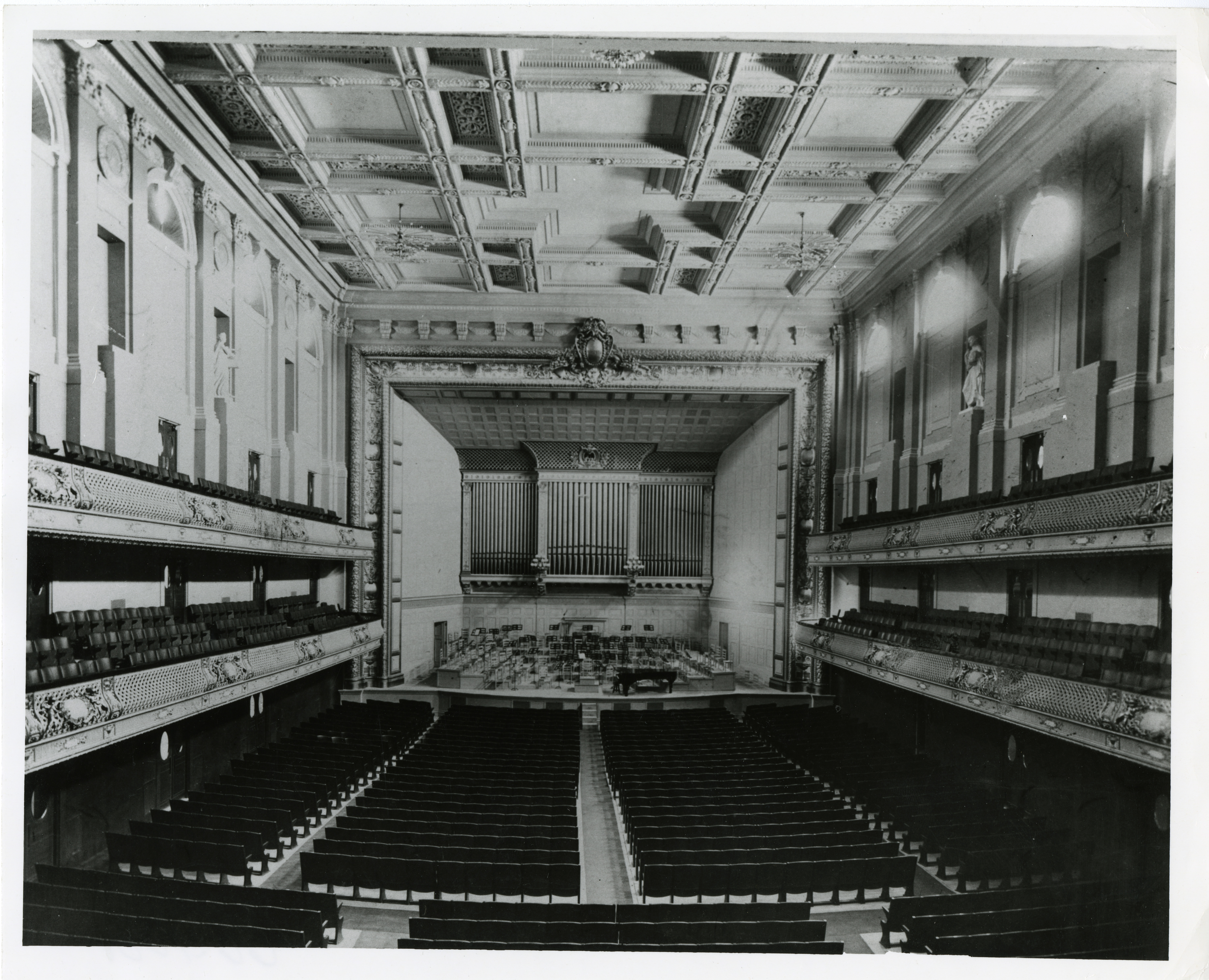 Interior of Boston Music Hall showing Apollo Belvedere in a niche at the rear of the hall
