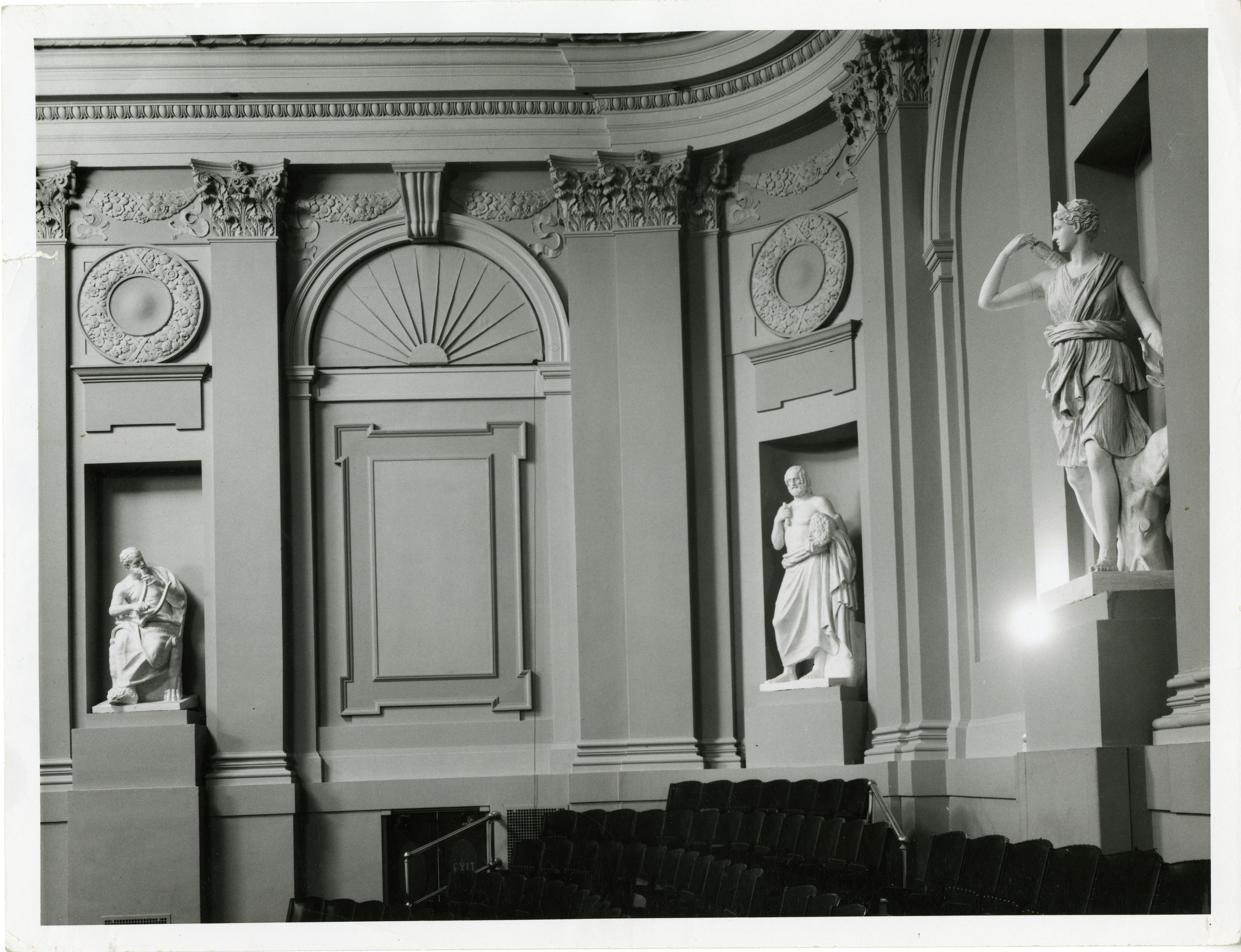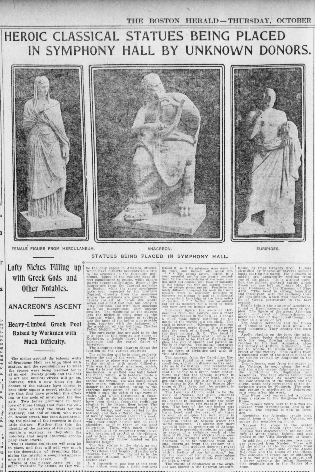 The remainder of the casts of Greek and Roman statues appeared over the next few years and were donated to Symphony Hall by a committee of 200 anonymous symphony-goers, led by Mrs. John W. Elliott.