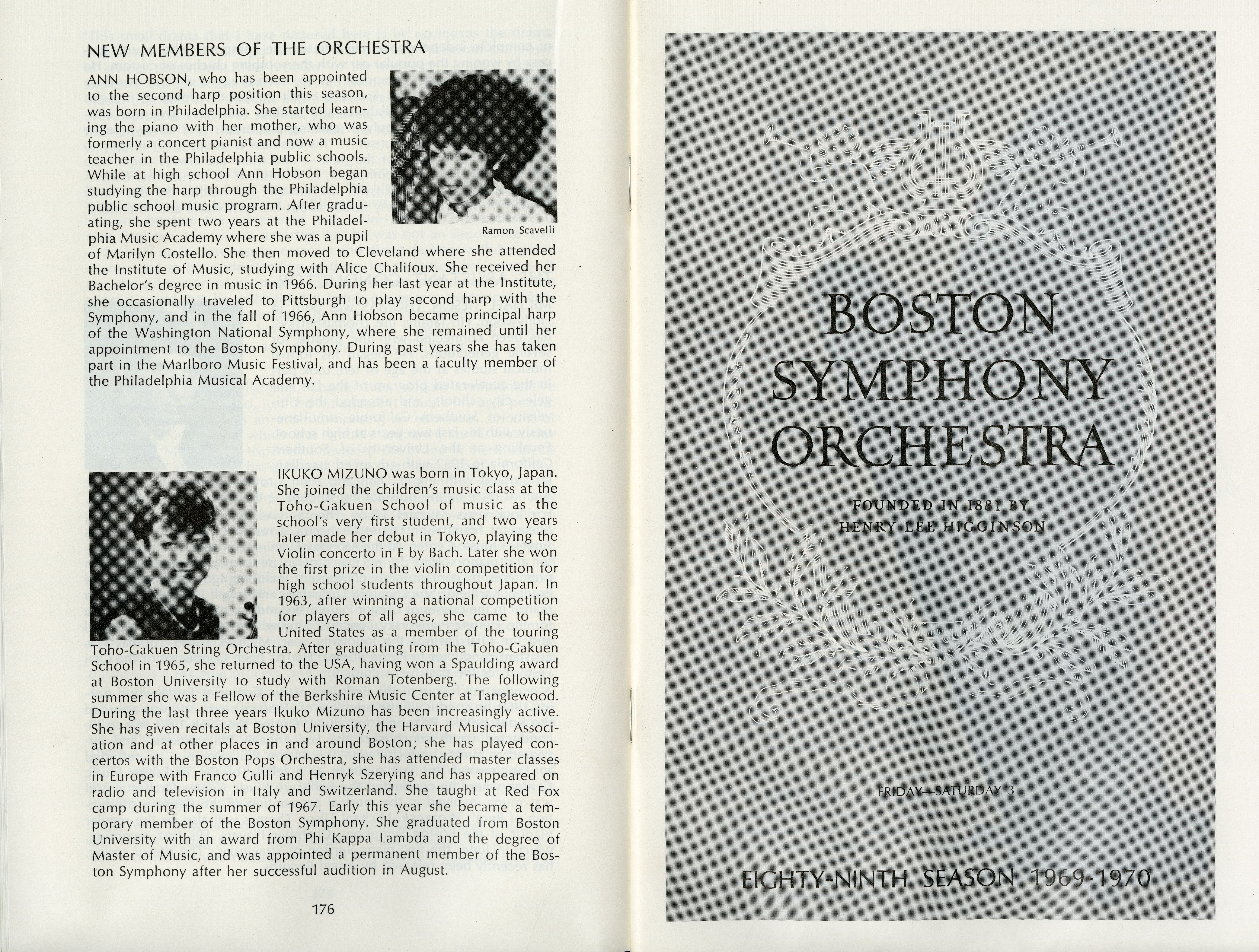 Page from the program book for the 1969-70 season highlighting the biographies of new BSO members Pilot (harp) and Mizuno (violin)