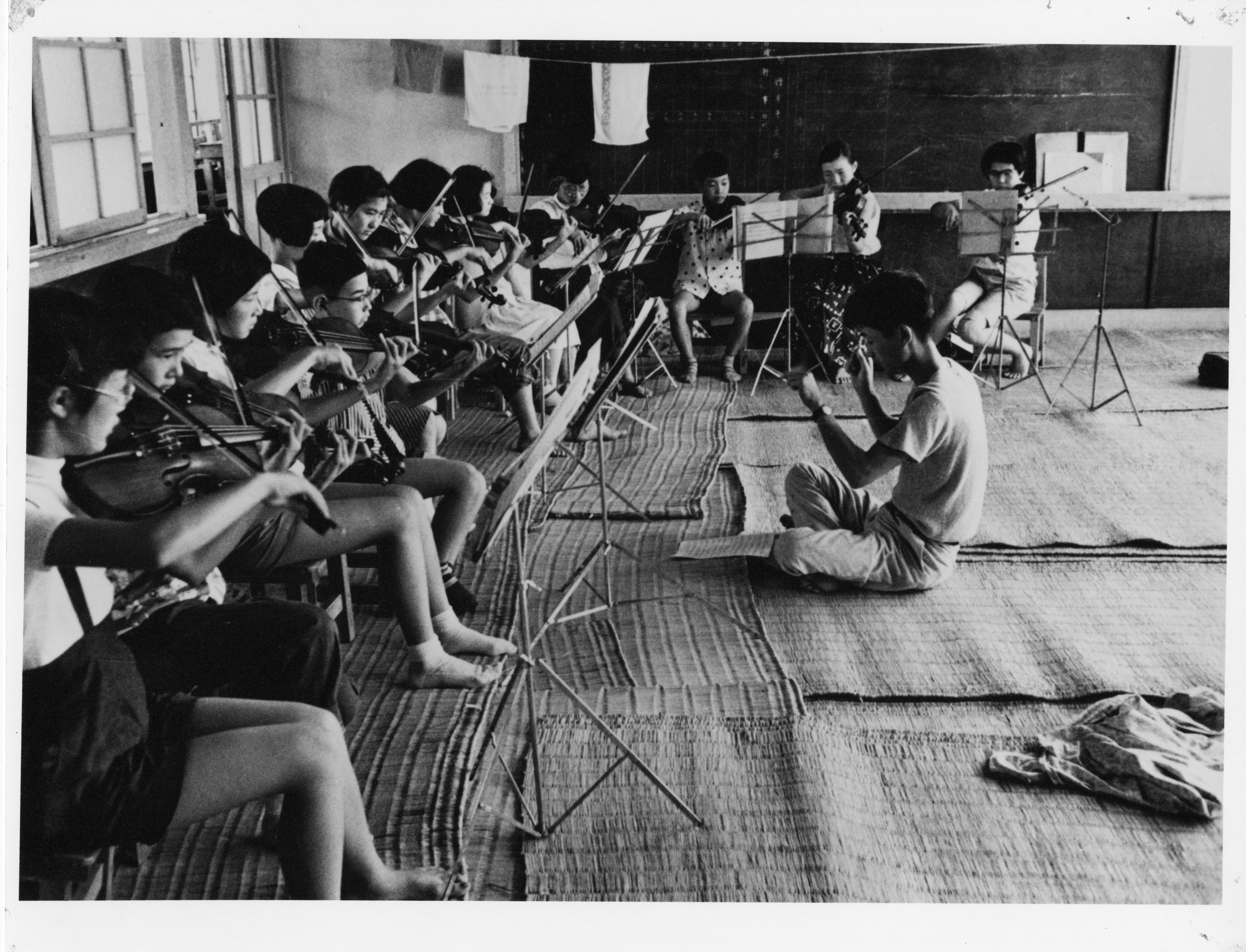 Aspiring conductor Seiji Ozawa leads several student musicians (including future BSO violinist Mizuno, seated fourth from the right against the chalkboard), in a practice session at the Toho Gakuen School of Music in Tokyo. (Photographer unknown)