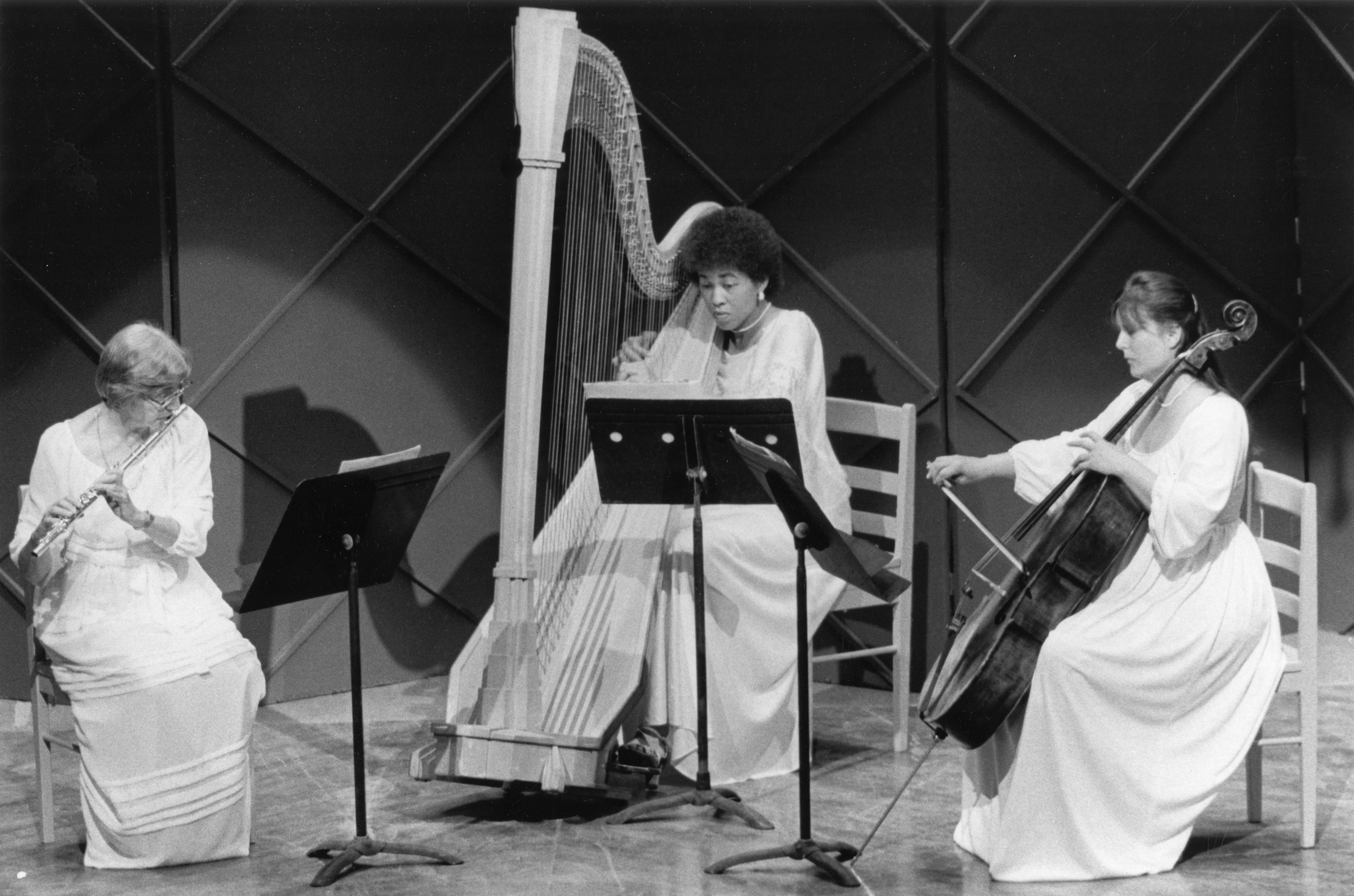 The New England Harp Trio, founded by Pilot in 1971, was comprised of women BSO players: Lois Schaefer (flute), Pilot (harp), and Carol Procter (cello). (Walter H. Scott)
