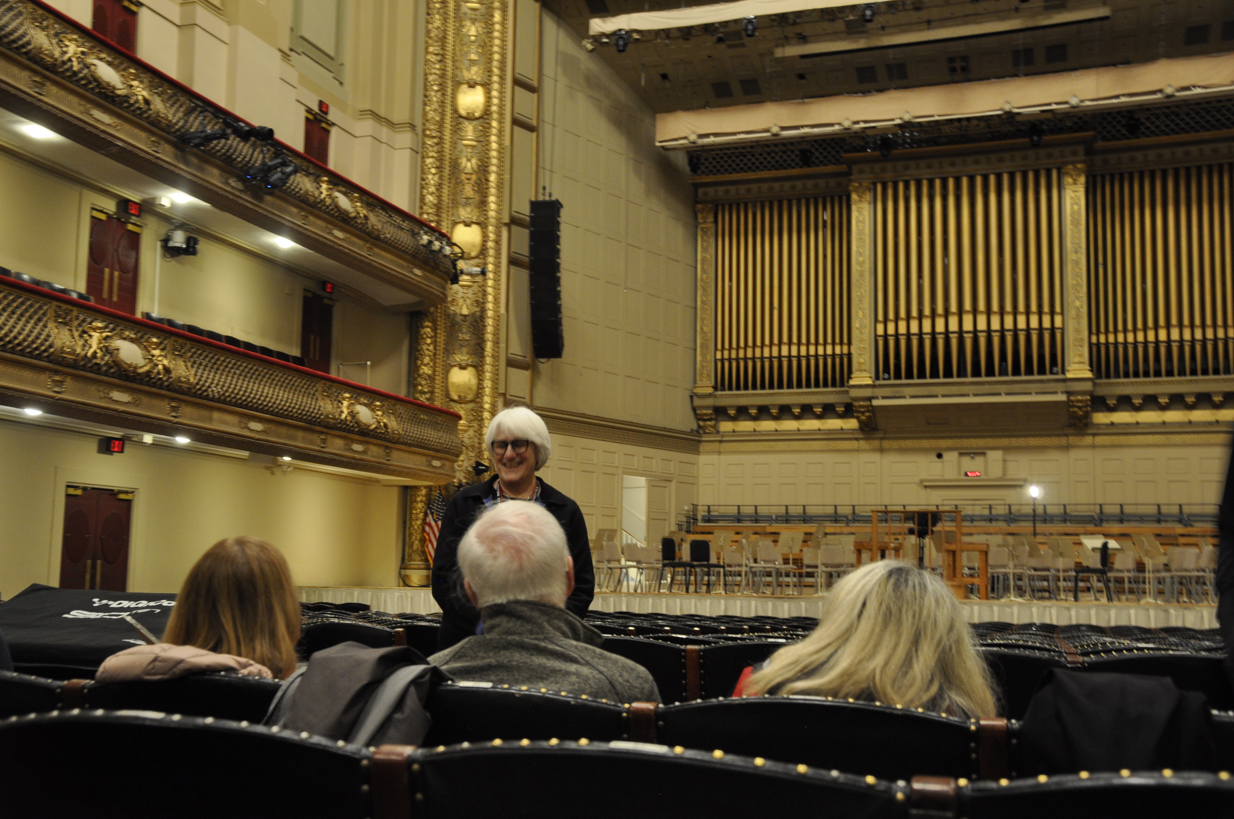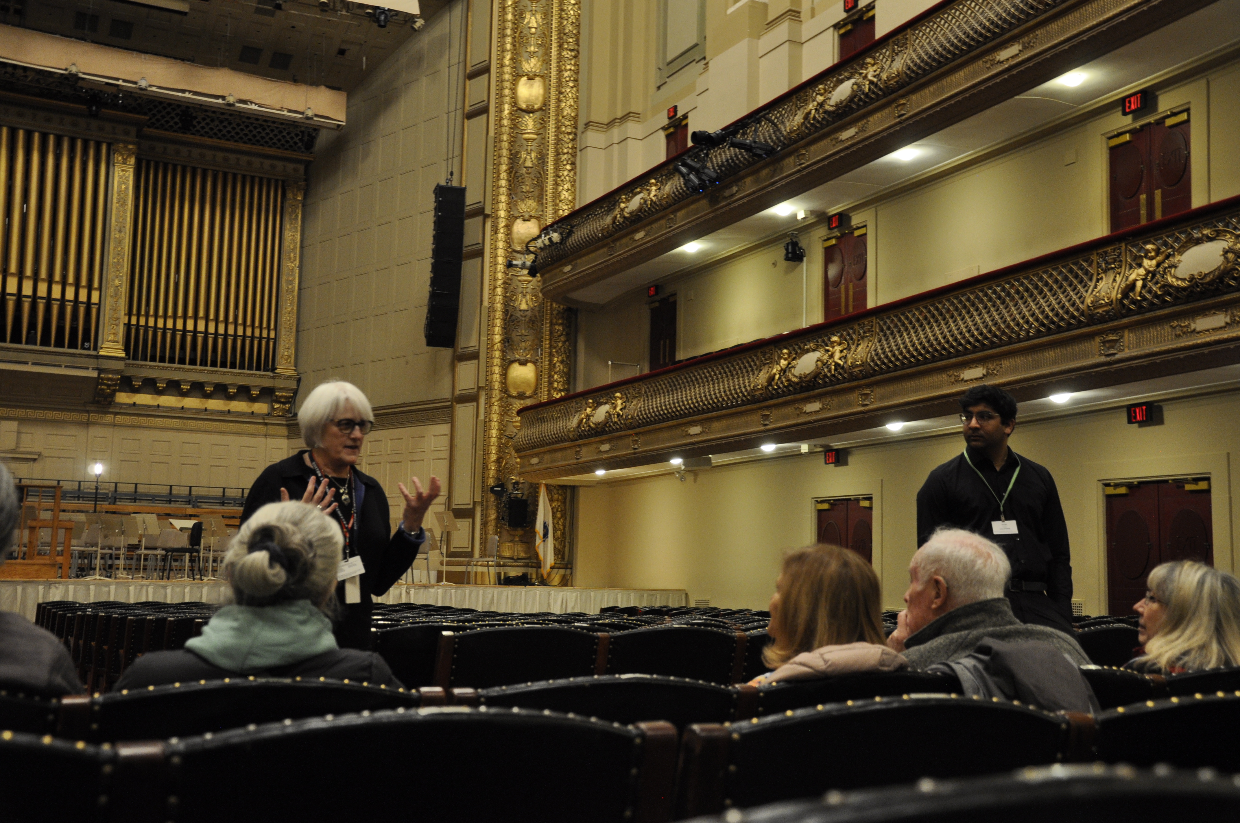Cathy Mazza addresses the tour group as they sit in the empty Symphony Hall.