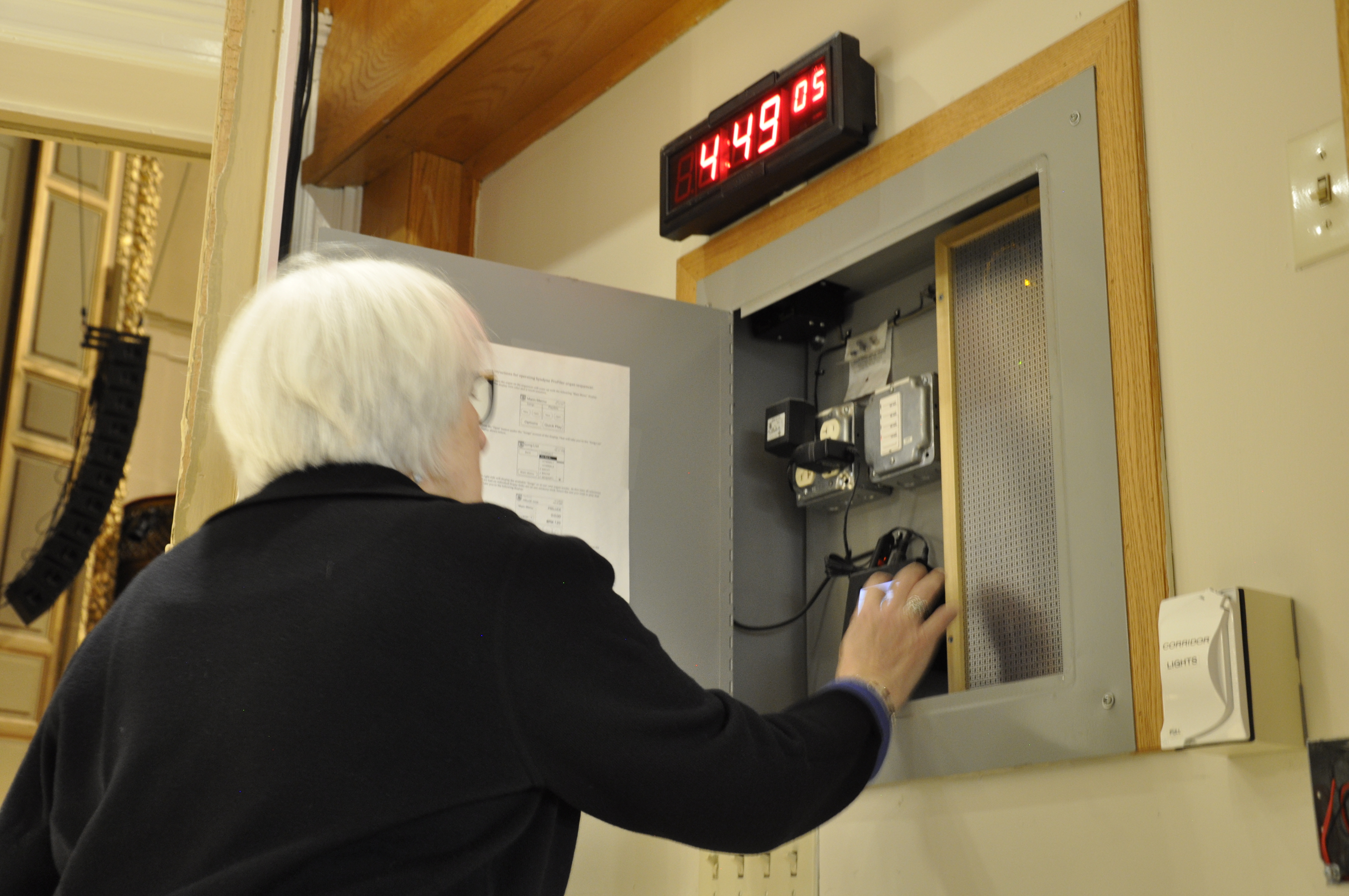 Cathy Mazza stands at the door backstage that leads onto the stage of Symphony Hall.